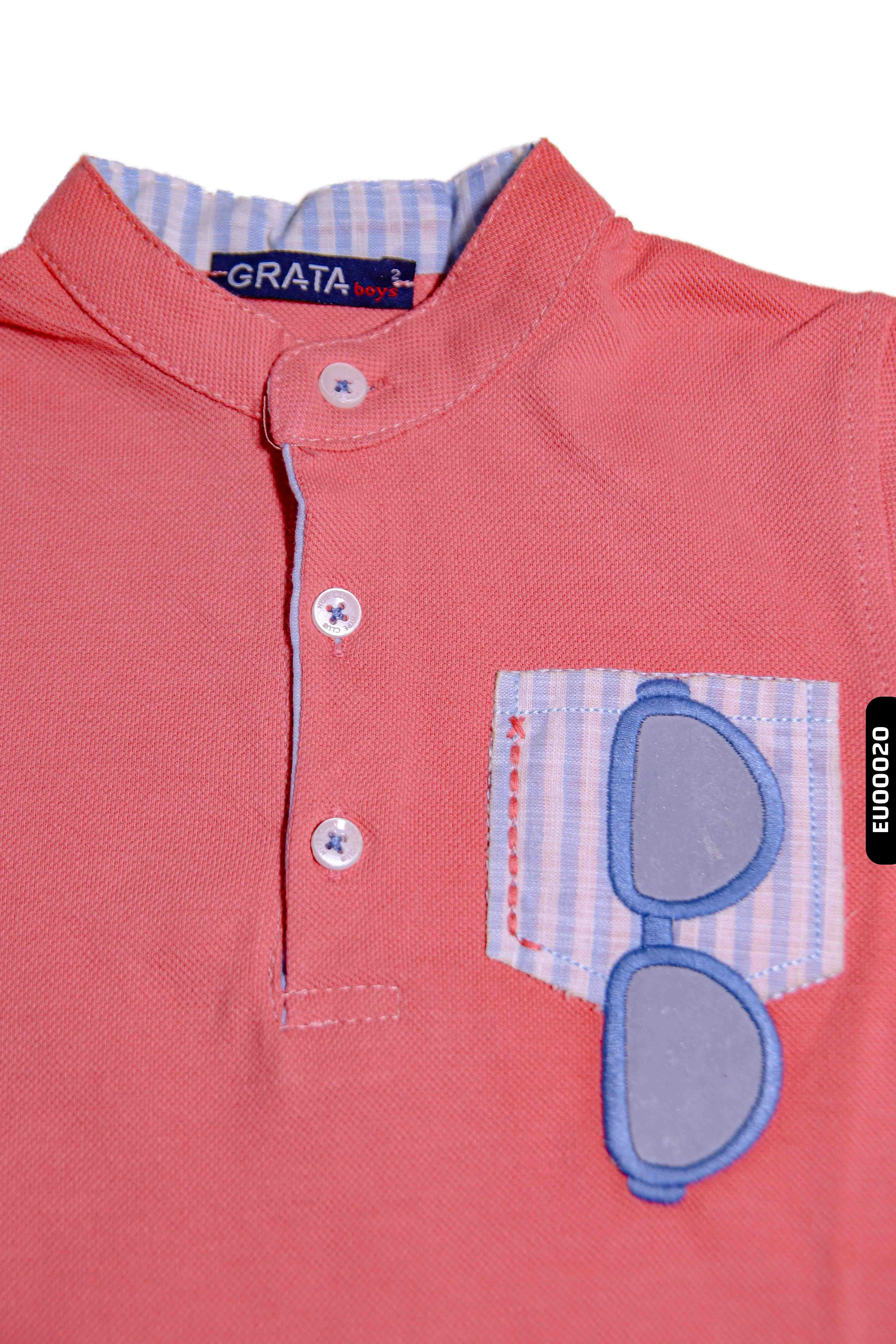 %100 Pamuklu Gözlük Baskılı Erkek Çocuk Düğmeli Polo Tişört 1-5 Yaş 8148 Kırmızı