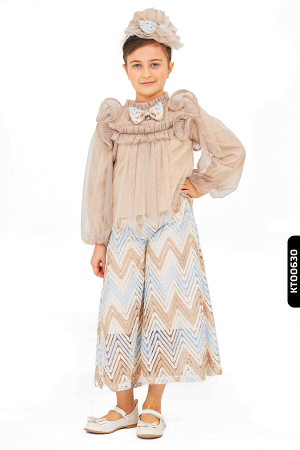 • Ajurlu Bohçalı Mendil Büzgülü Kollu 3'lü Kız Çocuk Pantolon Takım 6-14 Yaş 6561