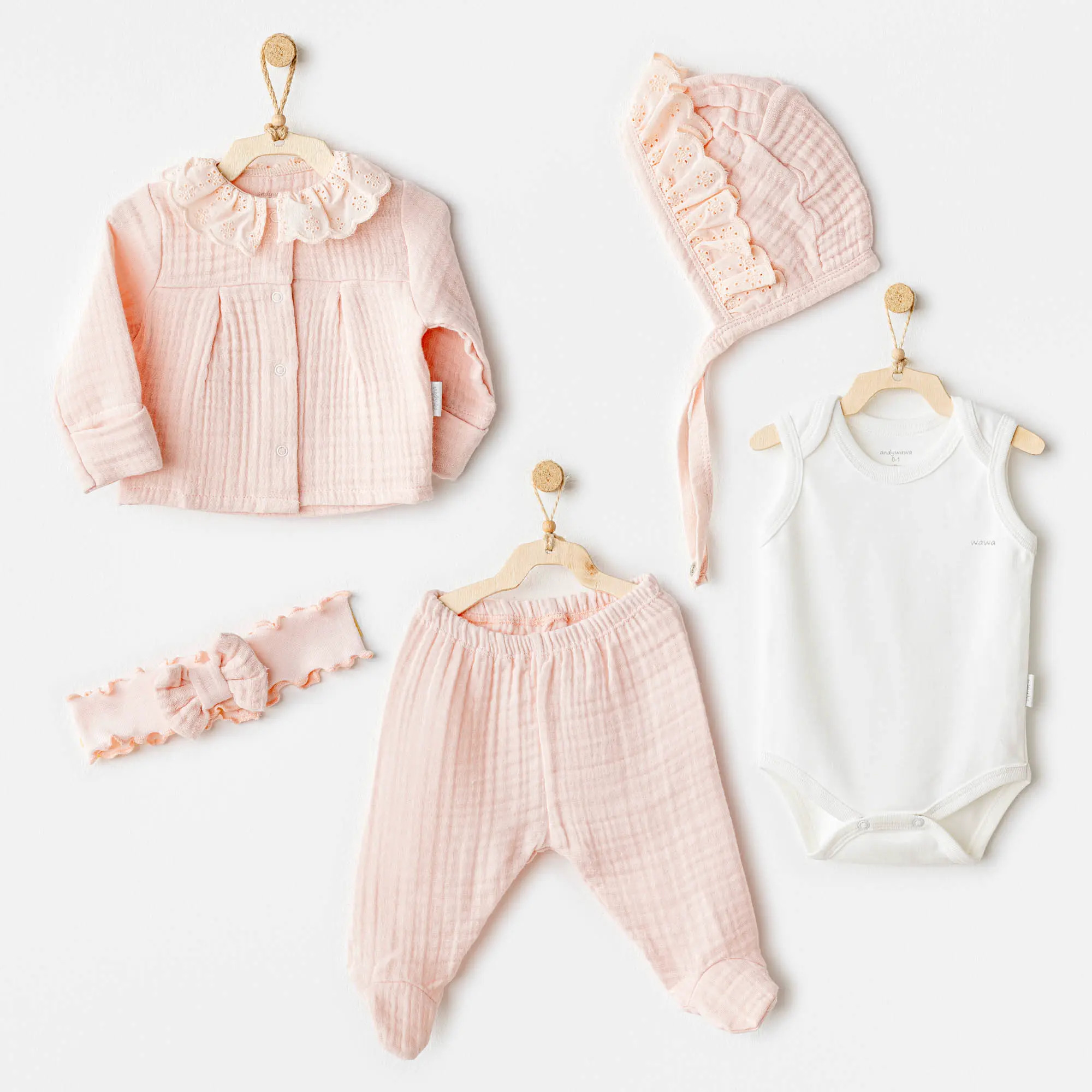 طقم ملابس الخروج من المستشفى من أنديواوا AC25840، مصنوع من قماش الموسلين الطبيعي، مكون من 5 قطع: