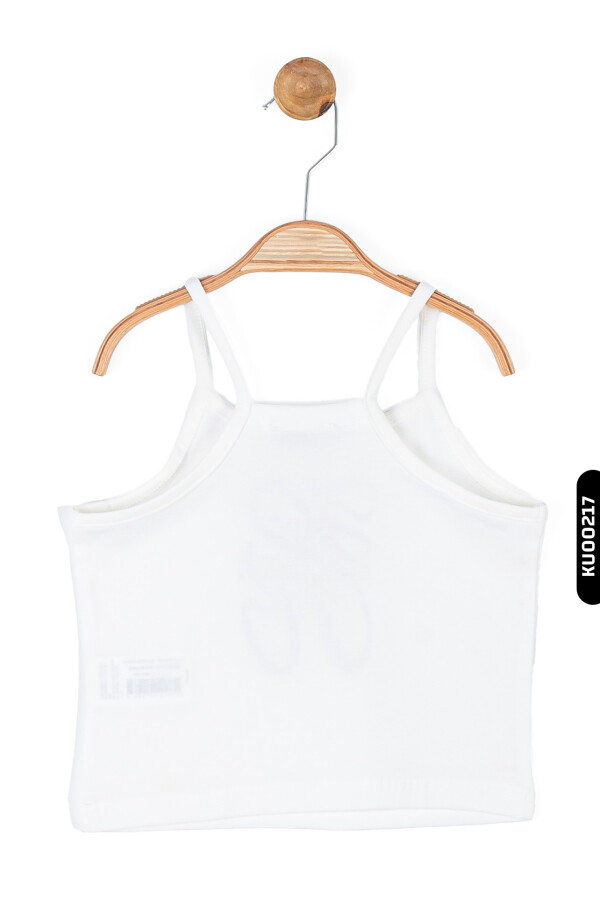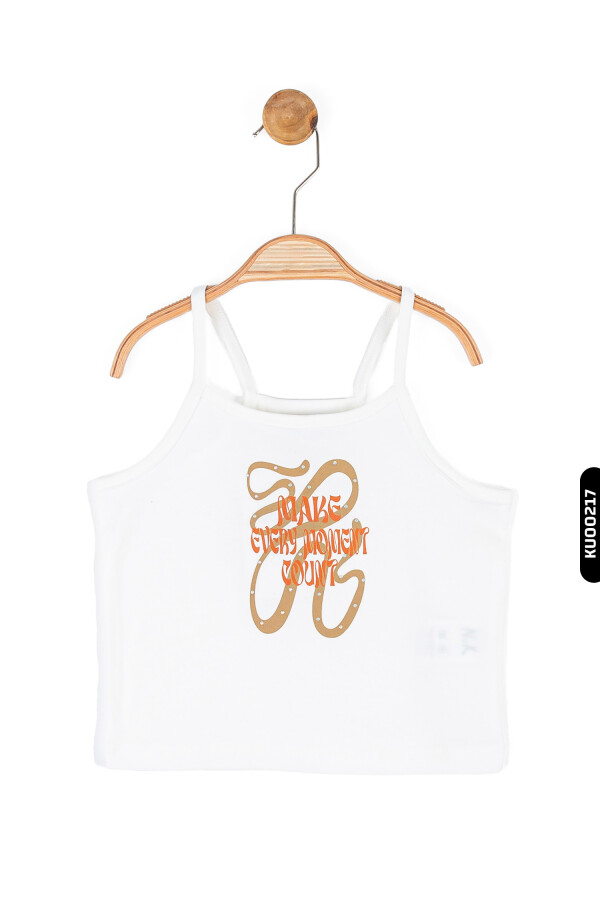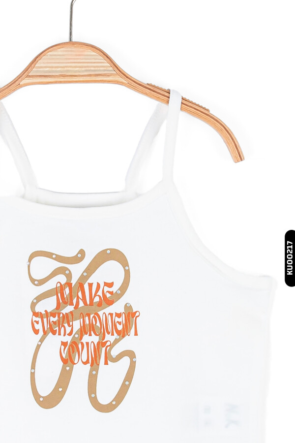 Bu kız çocuk askılı bluz, yaz ayları için ideal hafif ve rahat bir seçimdir. Sıfır yakalı ve ince askılı yapısıyla sıcak havalarda ferah kullanım sağlar. Ön kısmında "Make Every Moment Count" yazısı ve büyük dekoratif harf detayı bulunur. Bluz kısa boyda olup, sade ve şık tasarımıyla günlük kullanıma uygundur.