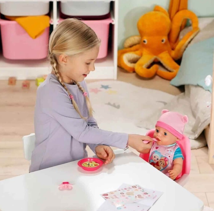 إذا بدت متعبة، ضع لهاية في فمها وأدر عينيها في اتجاه واحد لإغلاقهما. لفتح عينيها، ببساطة أدرهما في الاتجاه الآخر. إنه مثل السحر تمامًا، أليس كذلك؟ يمكن للطفلة المعجزة أيضًا الشرب والبكاء والأكل واستخدام المرحاض. عندما تضغط على بطنها، فإنها تذهب إلى الحمام بالفعل! سيحب الصغار الاعتناء بهذه الفتاة الصغيرة الرائعة واللعب معها!