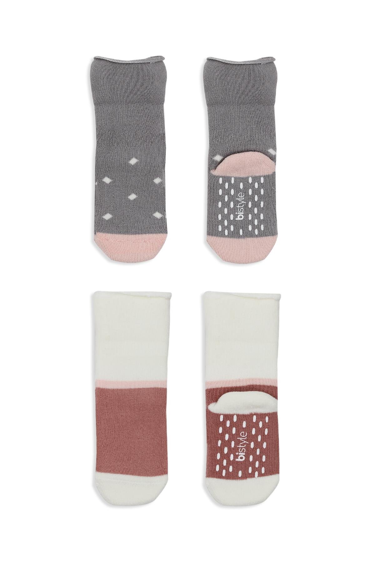 جوارب كاحل منفوشة غير قابلة للانزلاق منقطة ثنائية النمط، عبوة من قطعتين، BS10502، رمادي بودرة