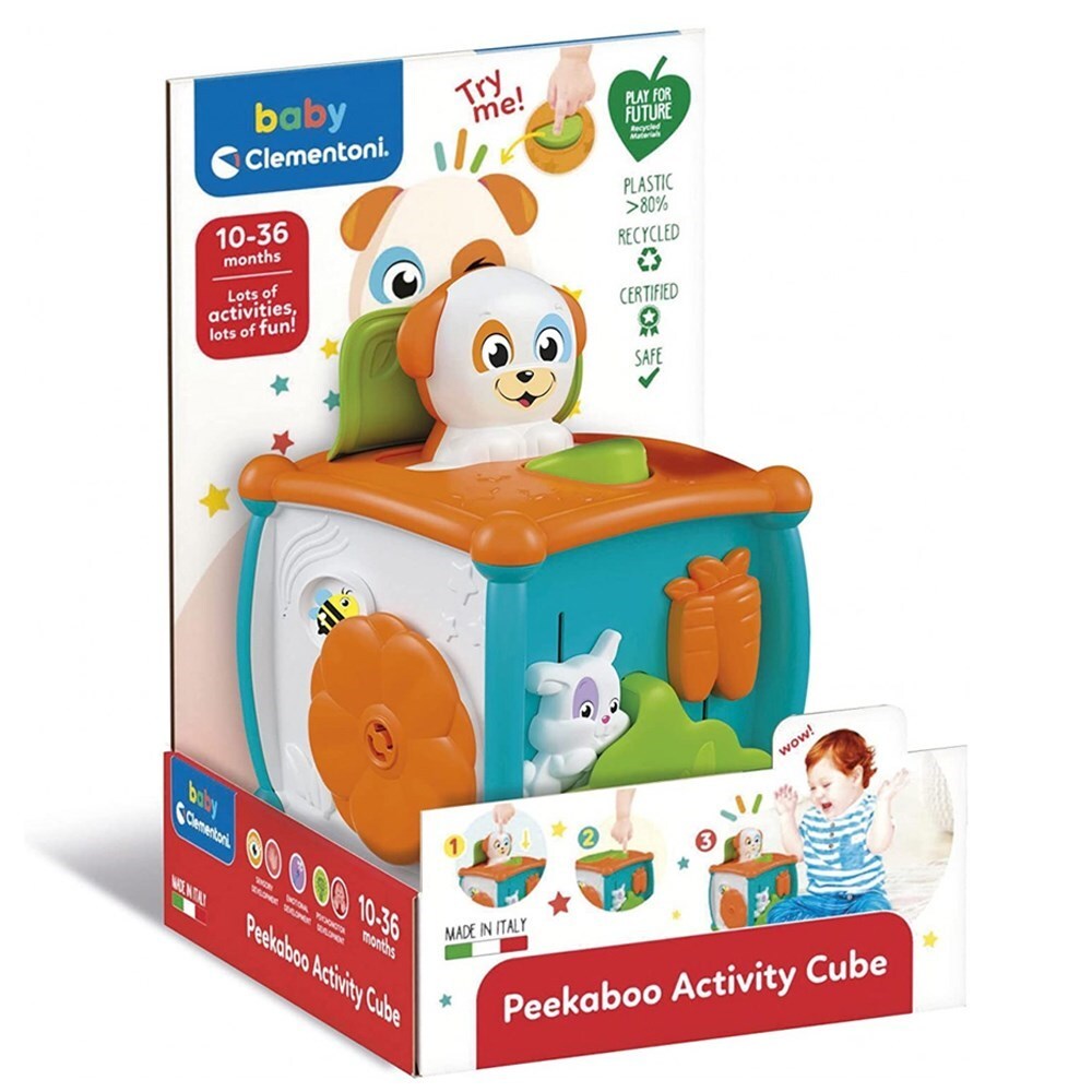 مكعب أنشطة الأطفال كليمنتوني ١٧٦٧٢، الميزات: مكعب سحري مليء بالأنشطة المدهشة لاكتشافها. خمس مناطق لعب مختلفة مناسبة للأطفال تساعدك على التركيز على نشاط واحد في كل مرة، وبالتالي تحسين تركيزك. عند الضغط على الزر، ينفتح الغطاء ويظهر كلب لمفاجأة مضمونة! أدر الزهرة، وستتحرك النحلة وتطير. يلتقط الأرنب الجزرة القافزة، وتقلب السمكة الصفحة. لعبة الغميضة. تروس تحفز البراعة. يوفر المكعب تحفيزًا حسيًا، ويحفز علاقات السبب والنتيجة، والمهارات الحركية الدقيقة، والفضول. المقاس: ٢٦ × ١٩ × ١٧.٥ سم