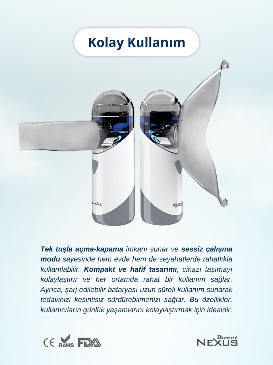 مميزات جهاز الاستنشاق الهوائي الشبكي المحمول من دايركت نكسس: يتميز هذا المنتج، الذي يتميز بجهاز استنشاق محمول، بخاصية شحن عملية في وقت قصير! يمكن شحنه عبر منفذ USB. سهل التنظيف. متوفر بأحجام صغيرة. يمكن استخدامه في كل مكان بفضل ميزاته سهلة الاستخدام. مميزات مميزة: هيكله المتين يضمن تفضيل المنتج حتى في أصعب ظروف العمل. تتراوح درجات حرارة تشغيله بين 3 درجات و40 درجة. يوفر رطوبة بنسبة 80%. لا يمكن للظروف القاسية أن تخيفه. لا داعي للاستماع إلى الضوضاء أثناء تشغيل الجهاز. يعمل عن طريق إنتاج صوت أقل من 25 ديسيبل. يمكنك الاستمتاع بجهاز الاستنشاق الذي يعمل بهدوء ودون صداع. يتميز بسعة كبيرة للأدوية. تبلغ كمية حجرة الدواء 8 مل. بفضل حجمه، يستمر الدواء الموجود فيه في العمل لأيام دون الحاجة إلى إعادة تعبئته.