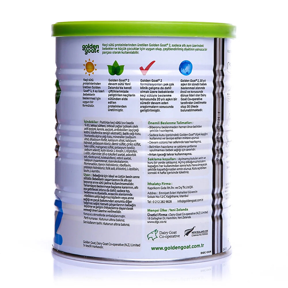 حليب جولدن جوت ٢، حليب ماعز، متابعة الرضاعة، من ٦ إلى ١٢ شهرًا، ٤٠٠ غرام. الميزات: يحتوي على حليب ماعز مبستر (٨٣٪ سائل). حليب جولدن جوت® ٢، متابعة الرضاعة، مناسب للأطفال من عمر ٦ إلى ١٢ شهرًا. حليب الأم هو الغذاء الأمثل للأطفال. حليب جولدن جوت® ٢، متابعة الرضاعة، مناسب لتغذية خاصة للأطفال الذين لا يستطيعون الرضاعة الطبيعية بعد الولادة. يُستخدم فقط في حال تعذر الرضاعة الطبيعية، وبنصيحة أخصائي رعاية صحية مؤهل. التخزين والتحضير غير السليمين ضاران بالصحة. تُنتج شركة DGC (نيوزيلندا) المحدودة حليب جولدن جوت® من حليب الماعز الذي تُربى في مزارعها الخاصة. شركة DGC (NZ) المحدودة هي الشركة الرائدة عالميًا في إنتاج حليب الأطفال من حليب الماعز. يساعد حليب Golden Goat® 2 Follow-On Milk على منع مشاكل الغازات بفضل بروتيناته سهلة الهضم. يهدف إلى دعم الصحة العامة للأطفال بفضل الزيوت النباتية المختارة. يتم إنتاجه من بروتينات حليب الماعز. أثناء الإنتاج، يتم استخدامه كامل الدسم وكوحدة كاملة دون فصله عن حليب الماعز. يهدف حليب Golden Goat® 2 Follow-On Milk إلى دعم النمو السليم للأطفال الصغار بمحتواه المدعم. محتوى الكربوهيدرات في حليب Golden Goat® 2 Follow-On Milk هو اللاكتوز فقط. لا يحتوي على سكر مضاف أو زيت نخيل أو فول الصويا أو نشا. يساعد على ضمان النمو والتطور الطبيعي للأطفال بفضل العناصر الغذائية الطبيعية والفيتامينات والمعادن التي يحتوي عليها. يدعم الهضم السهل بفضل التركيب البروتيني الخاص لحليب الماعز وقطر كريات الدهون الأصغر. تركيبته مدعمة بالفيتامينات والمعادن الأخرى الضرورية للأطفال مثل حمض الفوليك والحديد. بما أن حليب الماعز مصدرٌ للبروتين، فإن مكوناته الحيوية النشطة مثل النيوكليوتيدات والبولي أمينات والأحماض الأمينية الحرة موجودةٌ فيه بشكلٍ طبيعي. مناسبٌ للأطفال من عمر 6 أشهر فما فوق. يحتوي على الكالسيوم وفيتامين د. الفئة العمرية: من 6 إلى 12 شهرًا. وزن المنتج: 400 غرام. بلد المنشأ: نيوزيلندا.