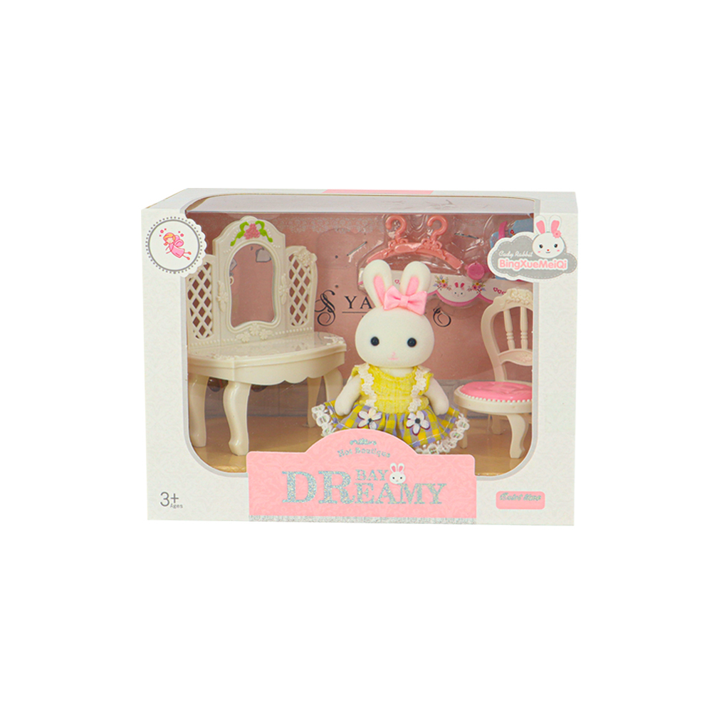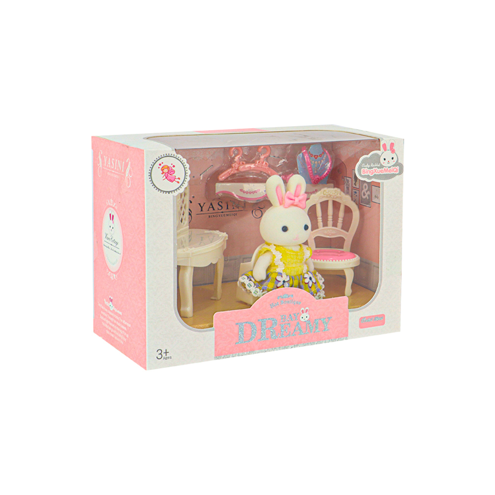 تعرّفوا على عائلة الأرنب الصغير وعالمه. وسّعوا آفاق خيالكم مع ملحقاته الصغيرة. يأتي هذا الأرنب الصغير بتصميم لطيف مع كرسي، وشماعات، ومجموعة مجوهرات، وخزانة ملابس.