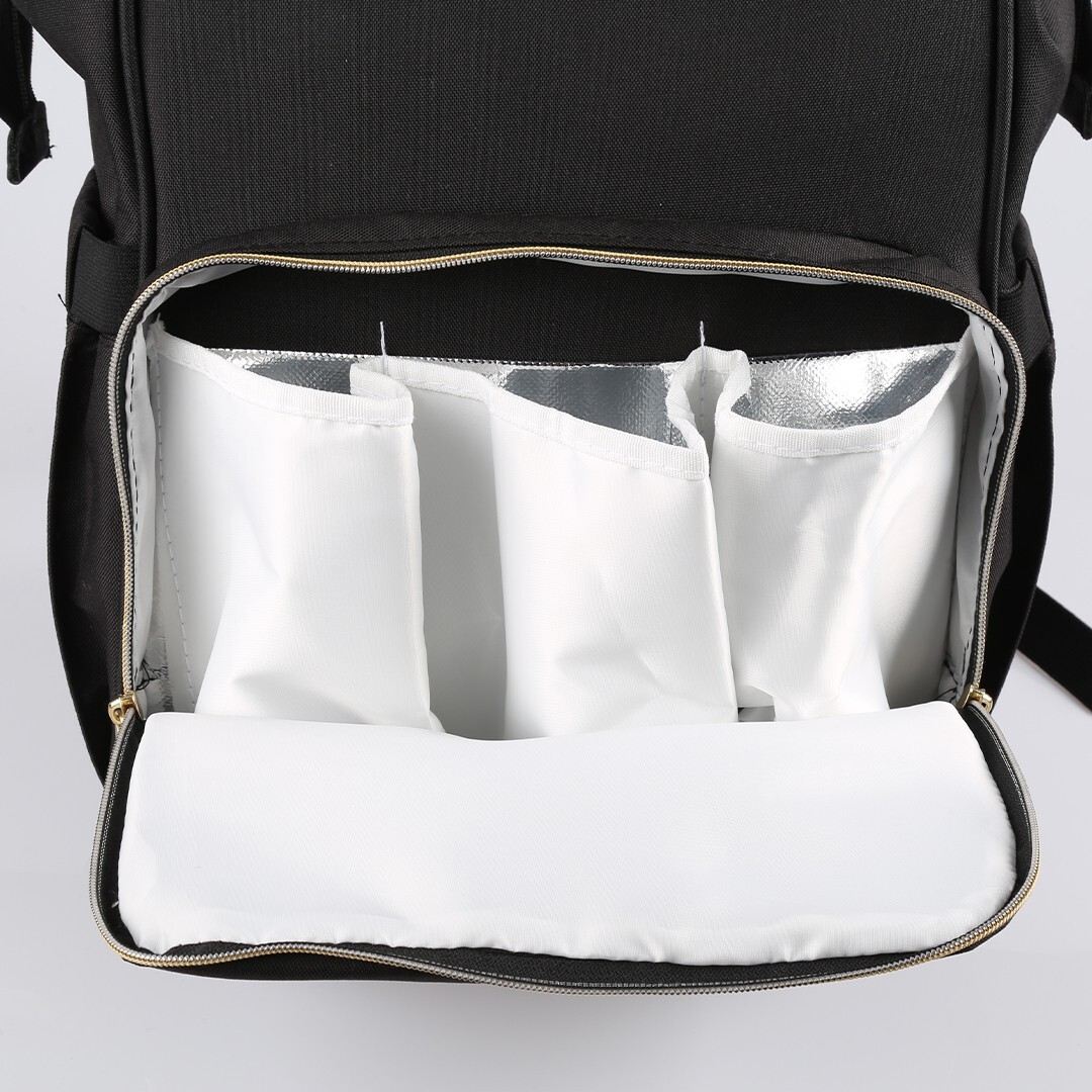 أحزمة كتف قابلة للتعديل حجم داخلي كبير مقابض حمل يدوية 3 حاملات زجاجات حرارية جيب أمامي بسحاب جيب خلفي بسحاب للأغراض الشخصية جيوب جانبية مرنة مادة مناسبة لصحة الطفل سحاب من الدرجة الأولى لا يحتوي على الفثالات.