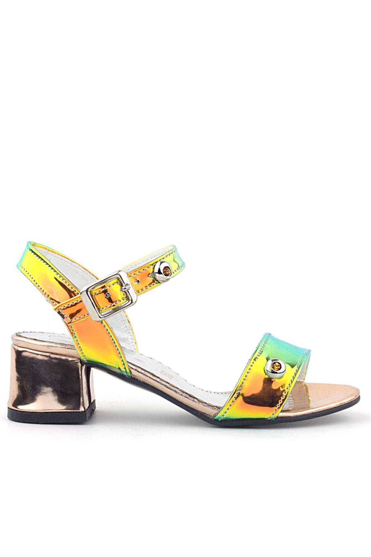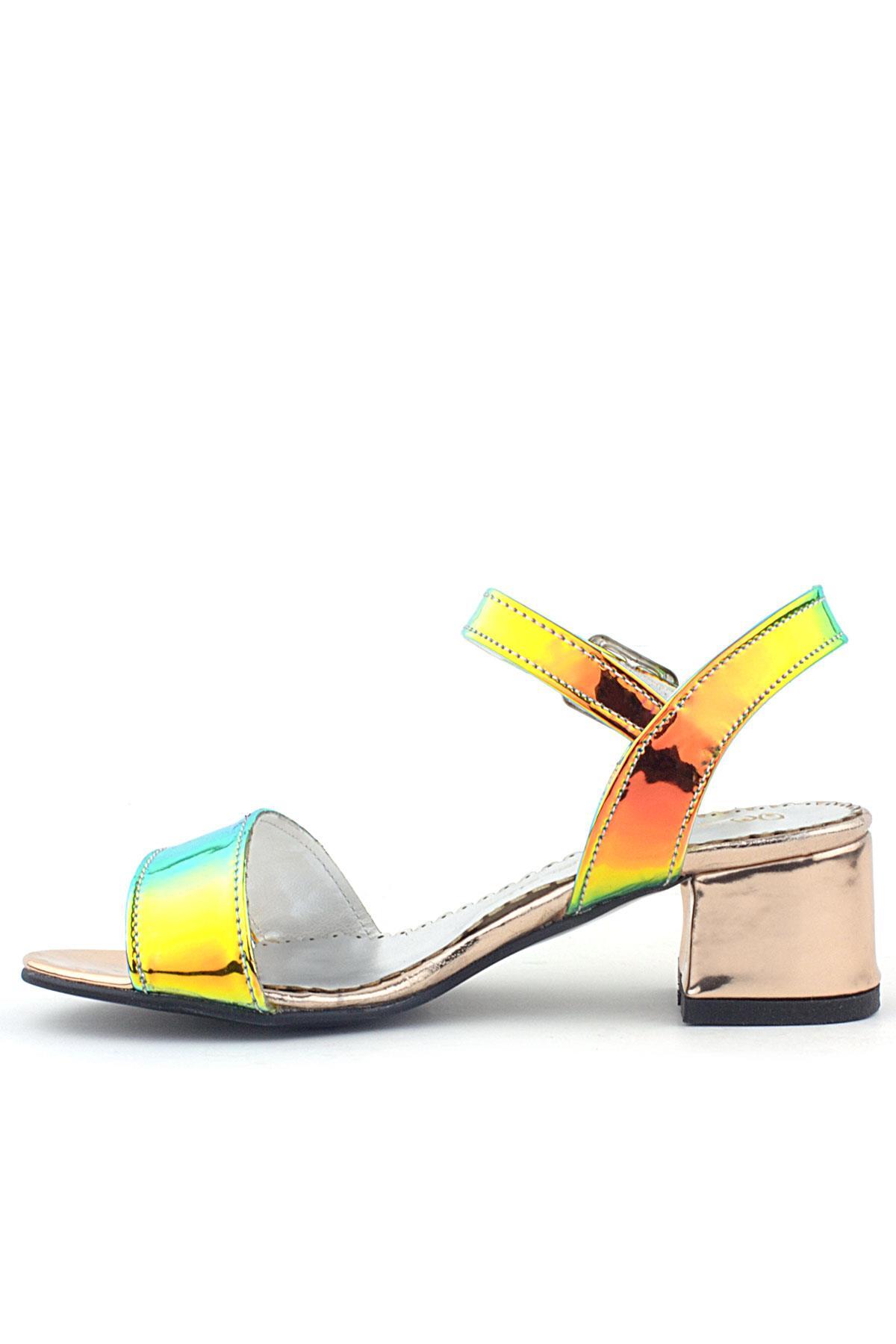 حذاء سهرة بناتي بكعب سميك وتفاصيل حجرية باللون الأخضر النحاسي بتصميم هولوغرام