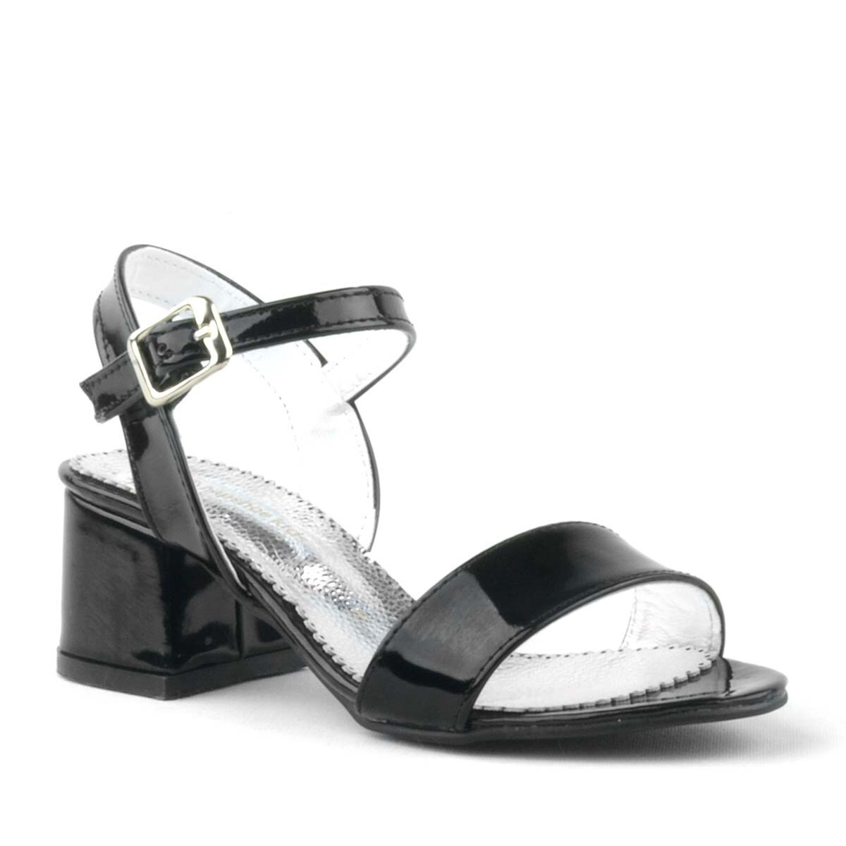 حذاء سهرة للبنات بكعب سميك من الجلد اللامع باللون الأسود