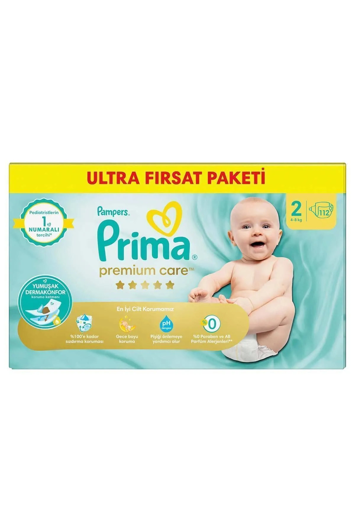 عبوة حفاضات بريما بريميوم كير للأطفال، مقاسين، ١١٢ قطعة. الميزات: