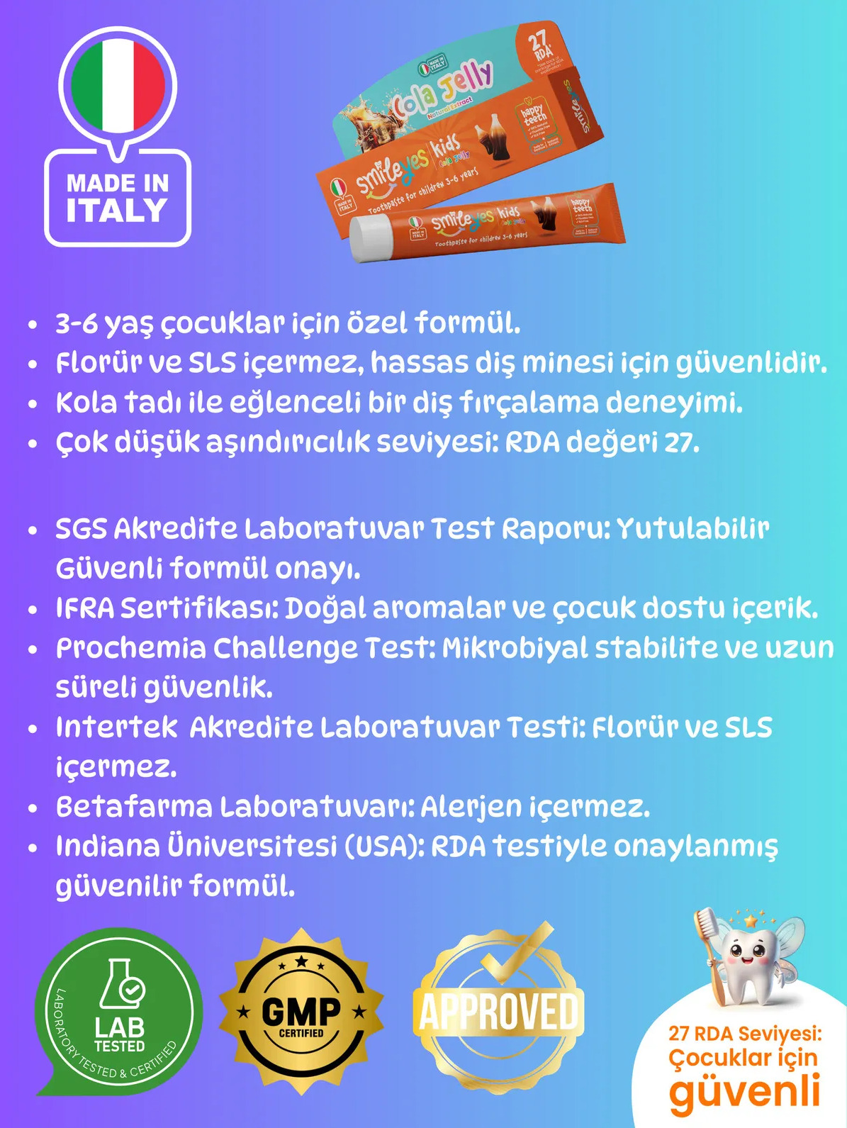 نكهة الفواكه المشكلة تجعل الأطفال يستمتعون بتنظيف أسنانهم، كما أنها تنظفها بلطف بمستوى كشط منخفض (27 RDA).