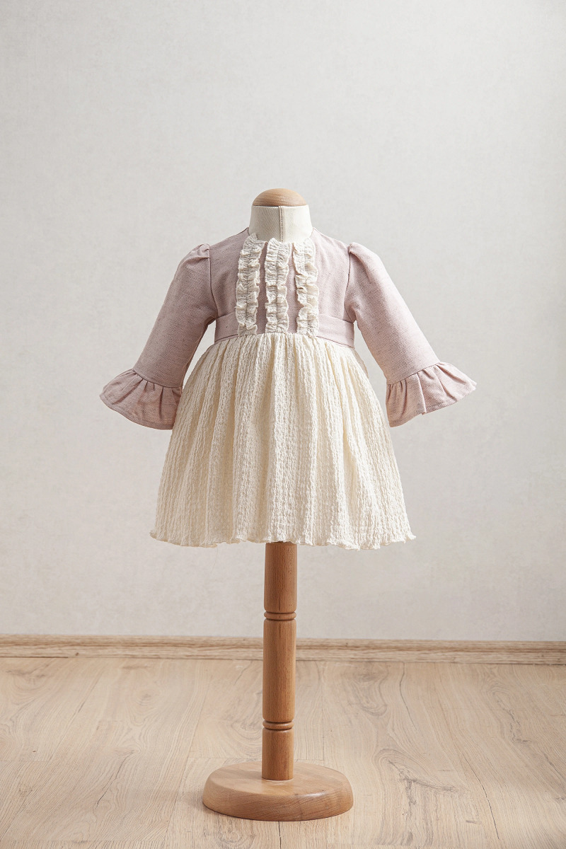 يجمع هذا الفستان للفتيات الصغيرات بين الأناقة والراحة مع البساطة الأنيقة للون البيج والتصميم المحكم.