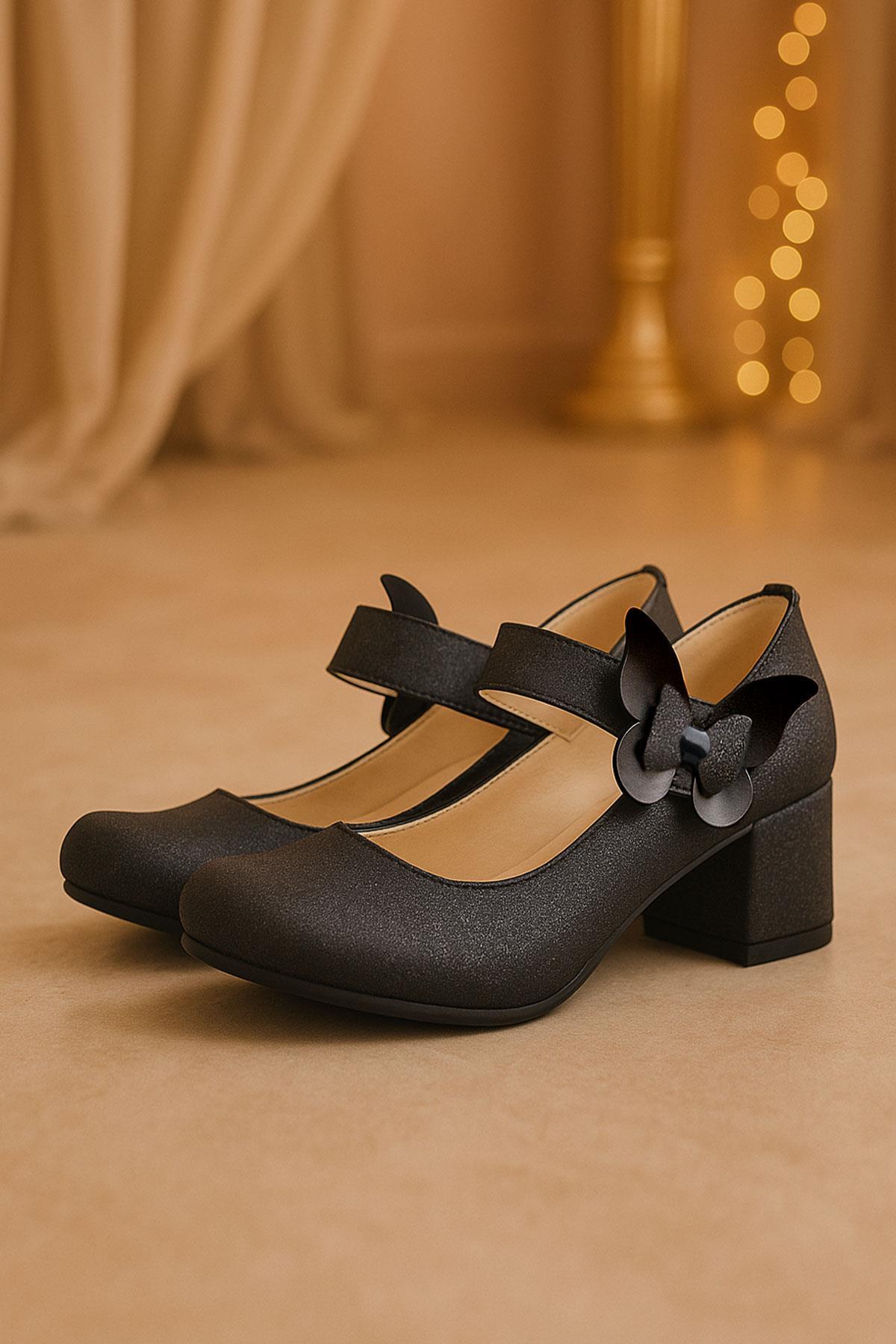 حذاء جيسي بكعب عالٍ مزين بشريط ساتان أسود للبنات