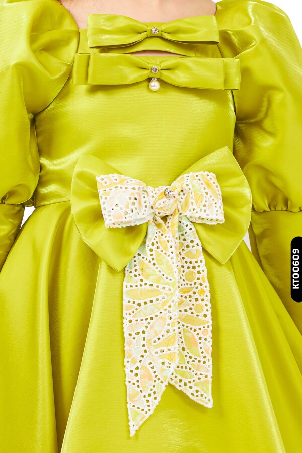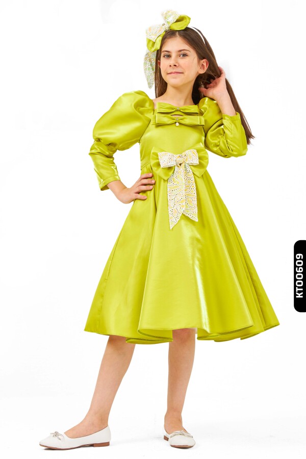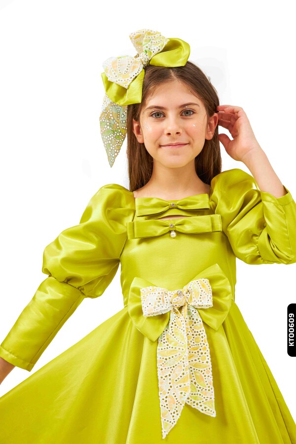 Gelince Haber VerBu özel tasarım kız çocuk elbisesi, yaz davetleri ve özel günler için mükemmel bir seçimdir. Parlak yeşil saten kumaştan üretilmiş olan elbise, midi boy uzunluğunda ve gösterişli balon kollara sahiptir. Sıfır yakalı modeli, göğüs kısmındaki iki farklı fiyonk detayı ve ortasında yer alan inci süslemeleri ile zarif bir görünüm sunar. Elbiseye uyumlu olarak tasarlanmış büyük fiyonk detaylı saç aksesuarı ile kombin tamamlanmıştır. Elbisenin bel kısmındaki dantel detaylı fiyonk, hem renk hem de doku açısından şıklık katmaktadır.