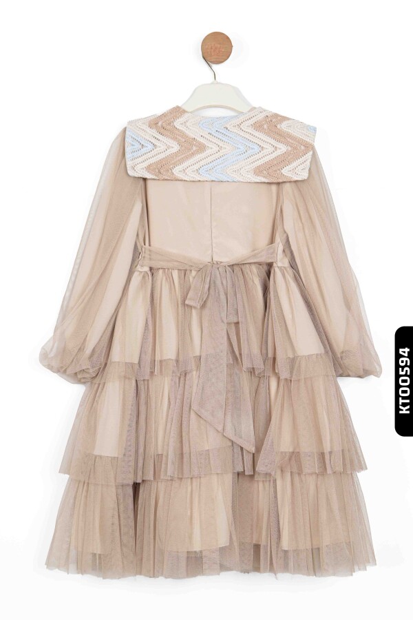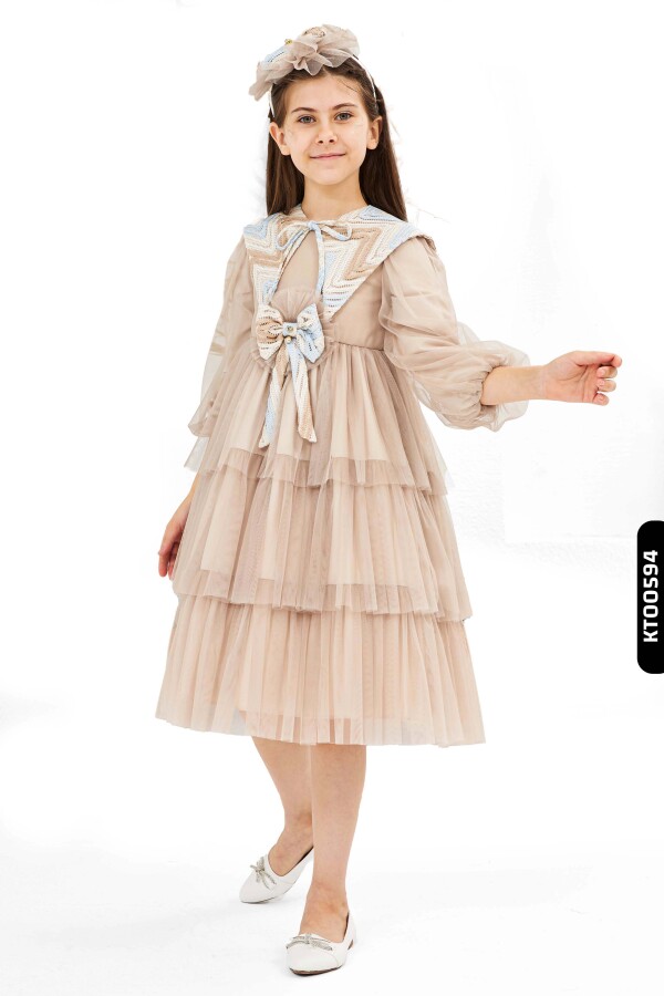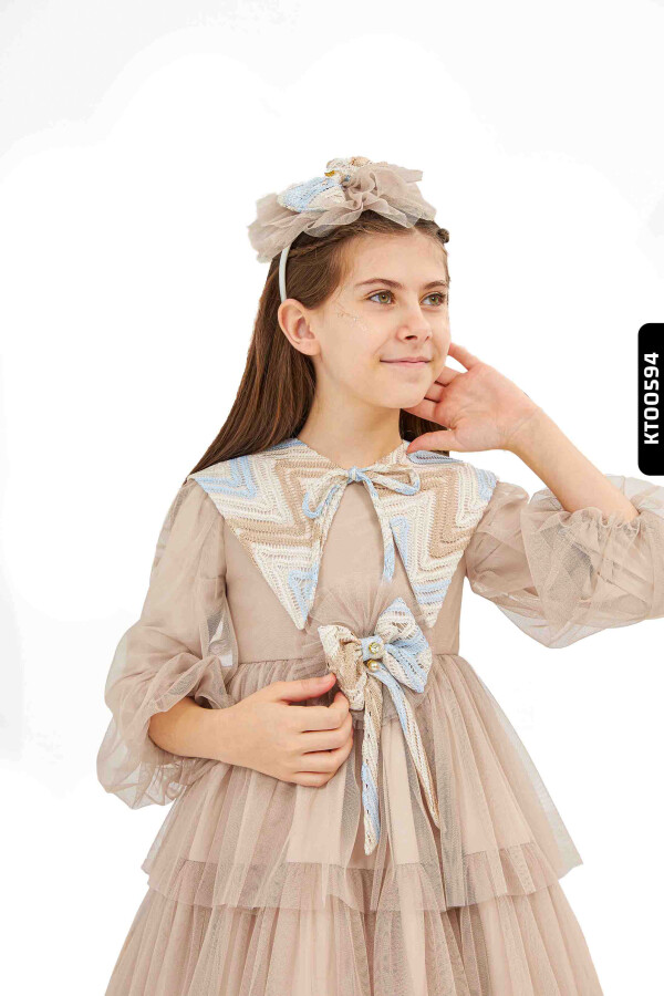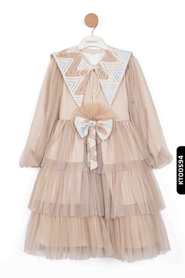 Bu kız çocuk elbisesi, yaz ayları için tasarlanmış zarif bir parçadır. Elbise, kahverengi tonlarında olup, tül kumaştan yapılmış kat kat volanlı etek detayıyla dikkat çeker. Uzun, hafif kabarık ve transparan tül kollara sahip olan elbisenin yakası, renkli örgü detaylar ve fiyonkla süslenmiştir. Yakadaki renk geçişleri mavi, beyaz ve kahverengi tonlarında olup, elbiseye şık ve sevimli bir hava katar. Elbisenin ön kısmında büyük bir fiyonk ve incilerle süslenmiş detay yer almaktadır. Boyu midi uzunluğunda olan bu elbise, özel gün ve davetler için idealdir.