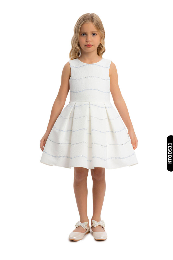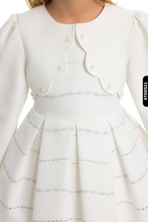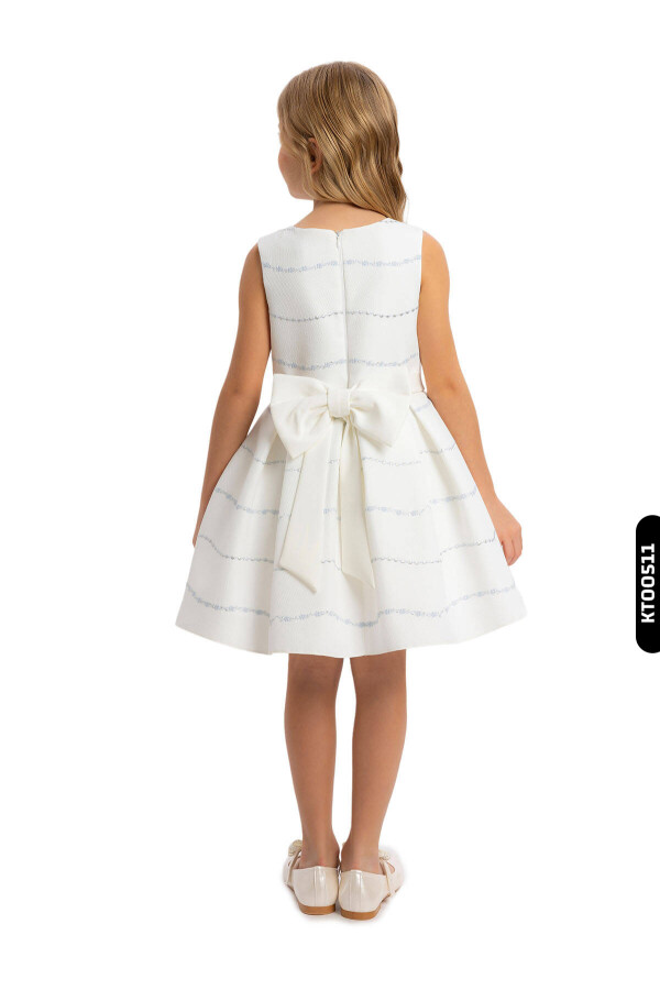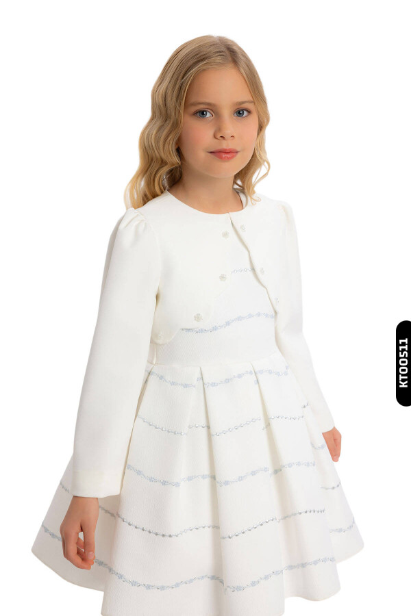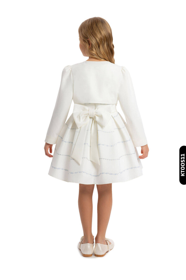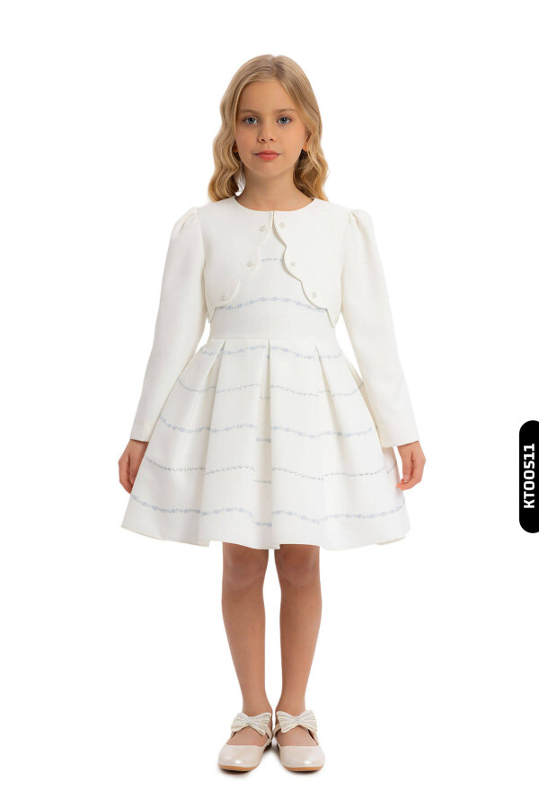 Bu zarif kız çocuk elbisesi, yaz davetleriniz ve özel günleriniz için mükemmel bir tercihtir. Elbisenin etek kısmında hafif mavi tonlarda ince çizgilerle süslenmiş beyaz bir kumaş kullanılmıştır. Üst kısmında, uzun kollu ve düğmeli kısa bir ceket bulunur. Ceket, yuvarlak yaka tasarımı ile sade ve şık bir görünüm sunar. Arkada büyük bir fiyonk detayı, elbiseye ekstra bir sevimlilik katmaktadır. Elbise, midi boyda olup, rahat ve hareketli bir kesime sahiptir.