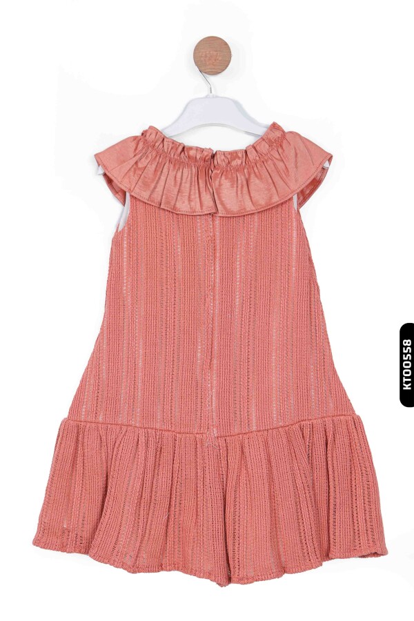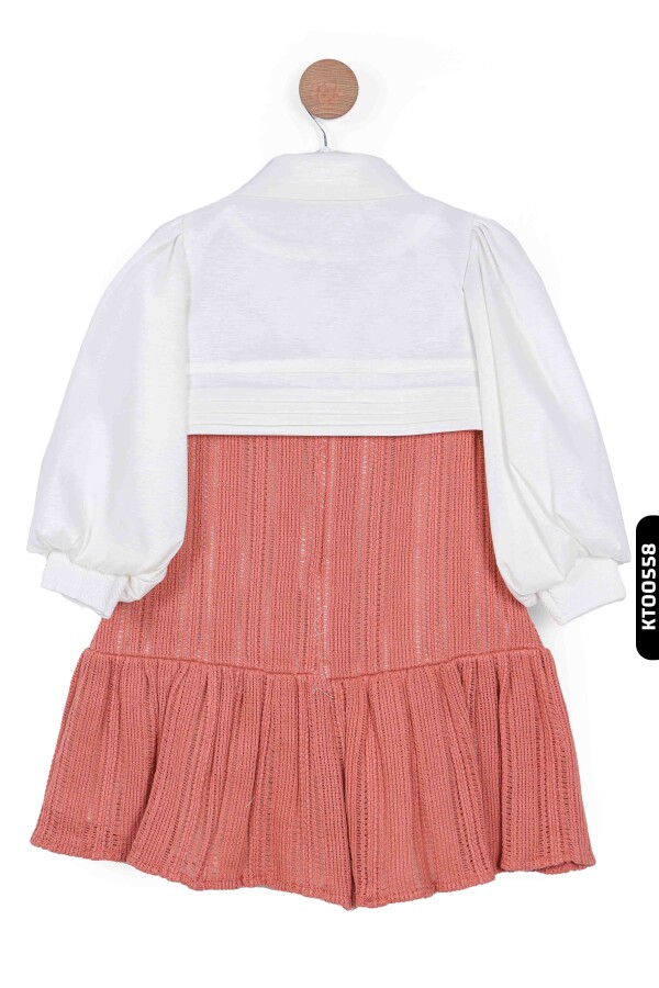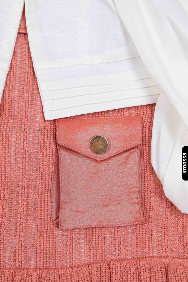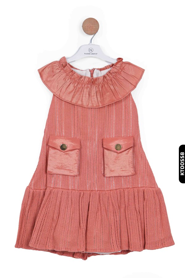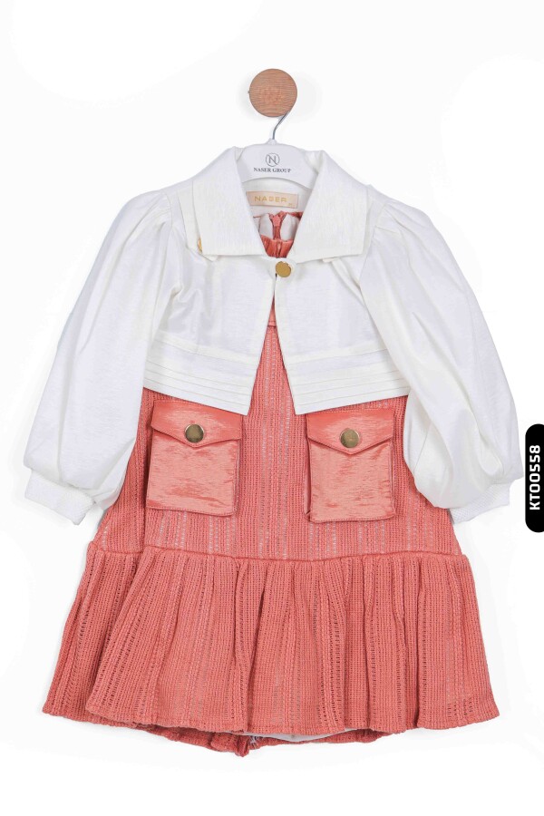 Bu kız çocuk elbisesi, yaz ayları için hem şık hem de rahat bir tercih sunuyor. Elbisenin koral rengi, örgü dokusuyla hareketlendirilmiş ve alt kısmında volan detayı bulunuyor. Ön kısımda, parlak kumaştan yapılmış cep kapakları şıklık katarken, sırt kısmında fermuarla kapanıyor. Beyaz kısa bol kollu ceket tarzı üst parça ise geniş yakası ve metal düğmesiyle kombine zarif bir hava katıyor. Bu set, özel günlerde veya günlük kullanımlarda tercih edilebilir.