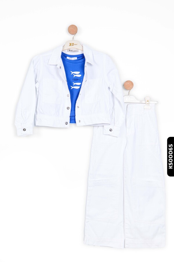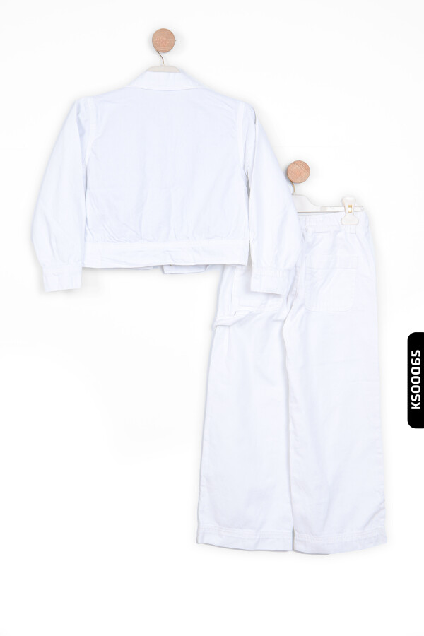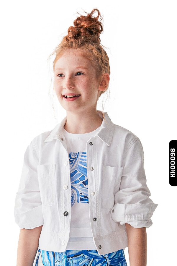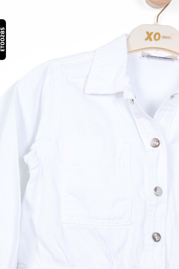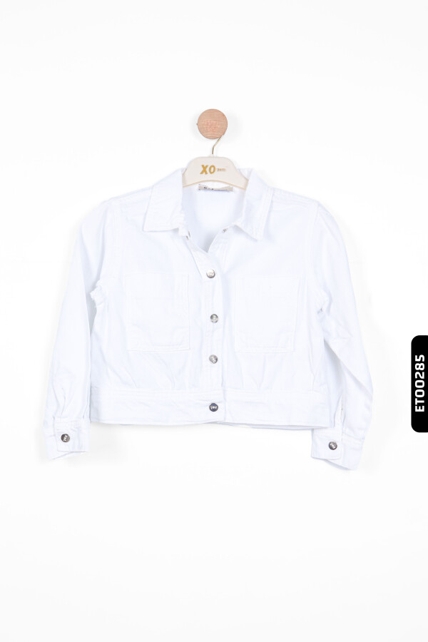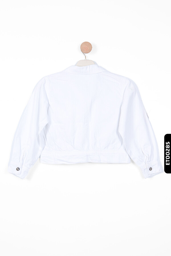 Yaz ayları için ideal olan bu beyaz kız çocuk ceket, hafif ve rahat yapısıyla günlük kullanıma uygundur. Kapüşon bulunmayan bu ceket, düğmeli (fermuarsız) ön kapama detayına sahiptir. Uzun kollu olup, kolları rahatça kıvrılabilir ve düğmeyle sabitlenebilir. İki ön cep detayı cekete şıklık katarken, beli hafif oturan kesimi ile modern ve sportif bir görünüm sunar. Sade beyaz rengi, farklı renklerdeki kıyafetlerle kolayca kombinlenebilir.