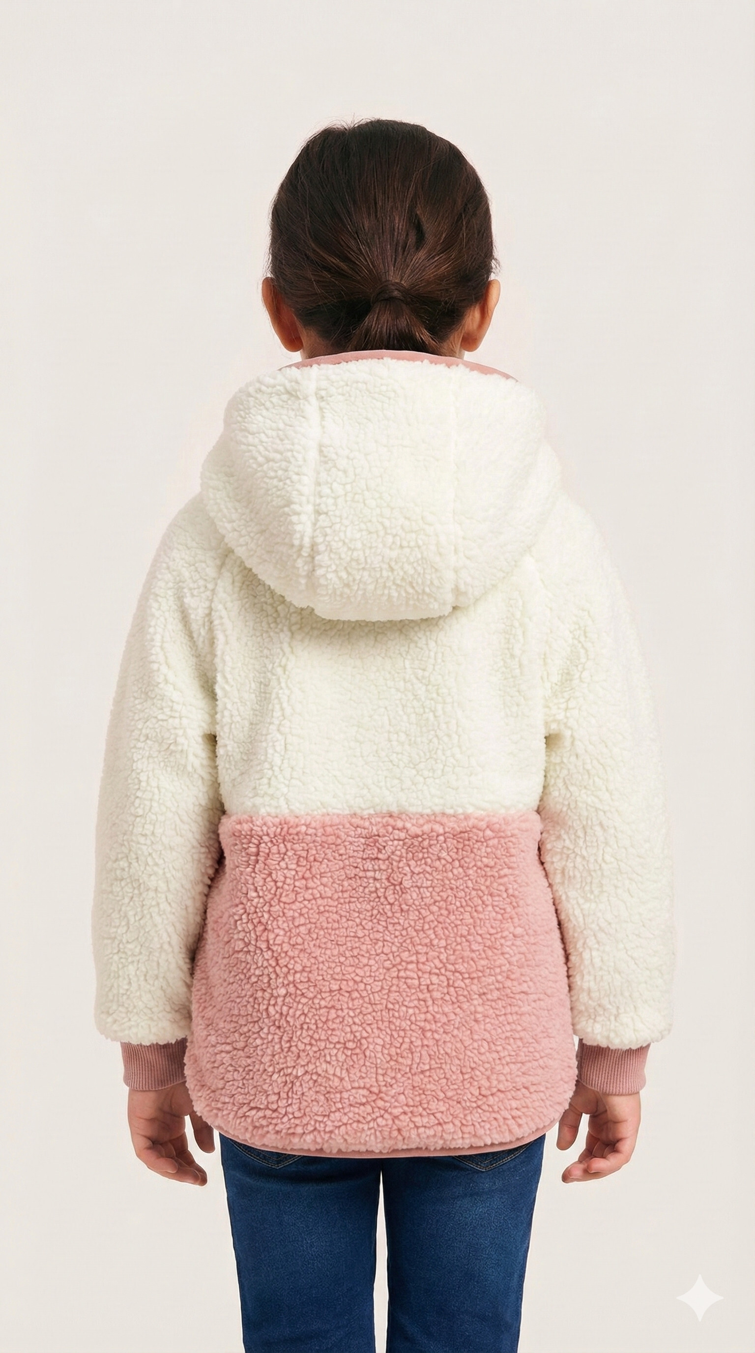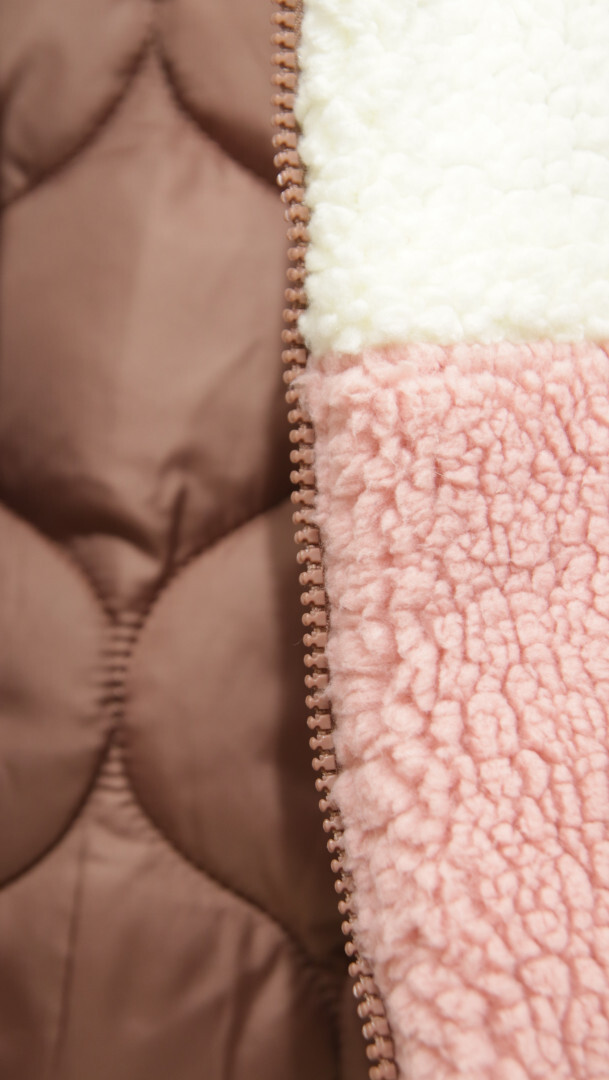 • Ekru ve pembe renkli, peluş dokulu kapüşonlu fermuarlı mont
