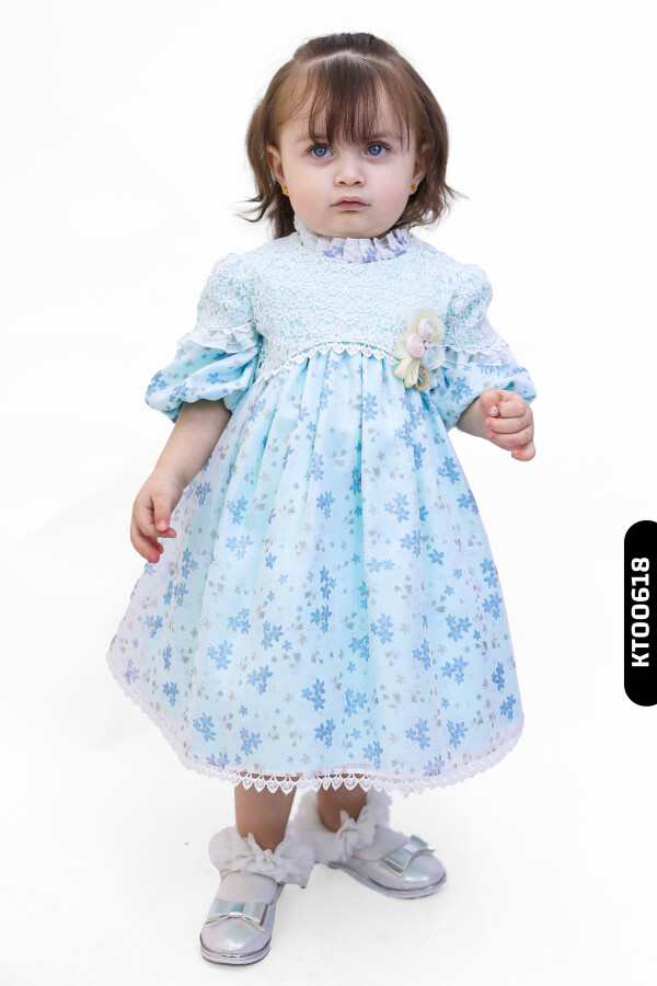 Degaje Yakalı Aplikeli Fırfırlı Büzgü Kollu Kız Çocuk Elbise 1-3 Yaş 1041 Turkuaz