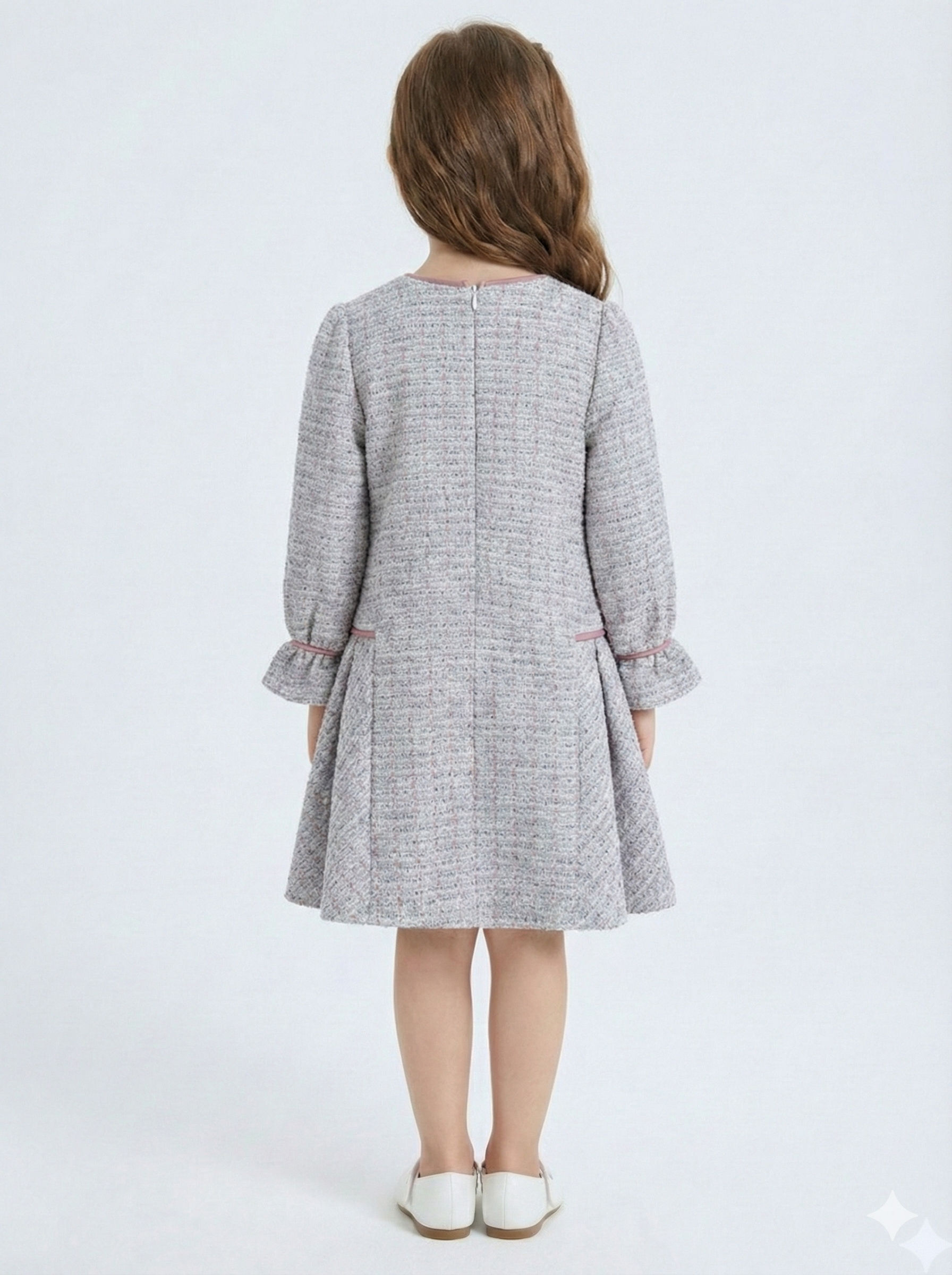 Deri Fiyonklu Büzgü Kollu Tüvit Kız Çocuk Elbise 3-7 Yaş 4415 Mor