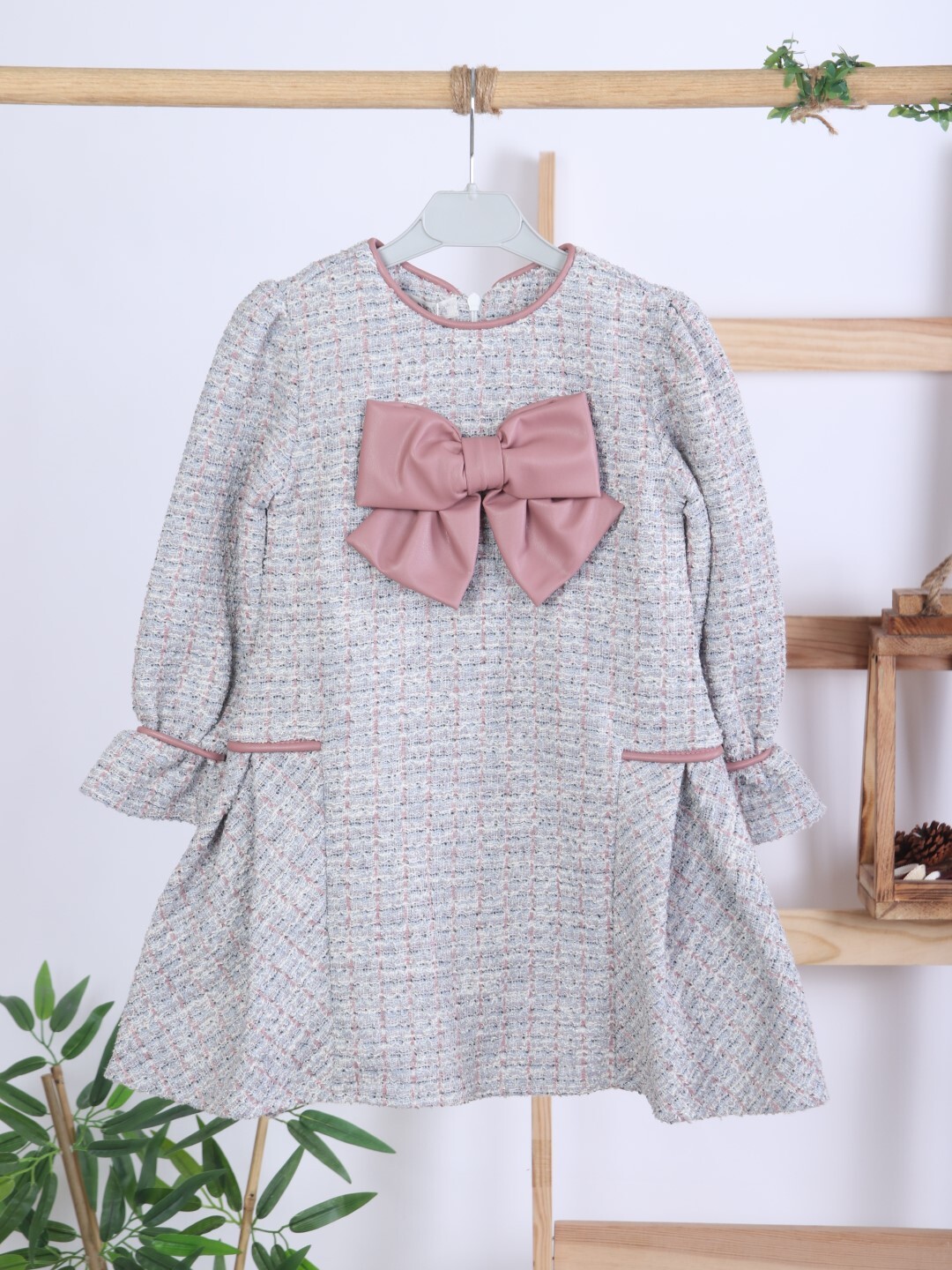 Bağcık Detaylı Beli ve Kolu Büzgülü Kız Çocuk Elbise 4-8 Yaş 4418 Gül Kurusu