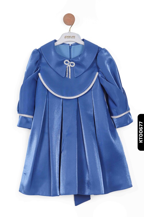 Devrik Yakalı Büzgü Kollu Katlanmış Kemersizli Kız Çocuk Elbise 3-10 Yaş 921 Mavi - 1