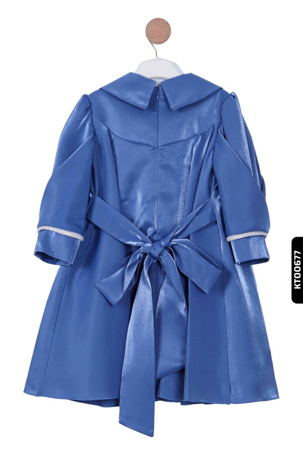Devrik Yakalı Büzgü Kollu Katlanmış Kemersizli Kız Çocuk Elbise 3-10 Yaş 921 Mavi - 3