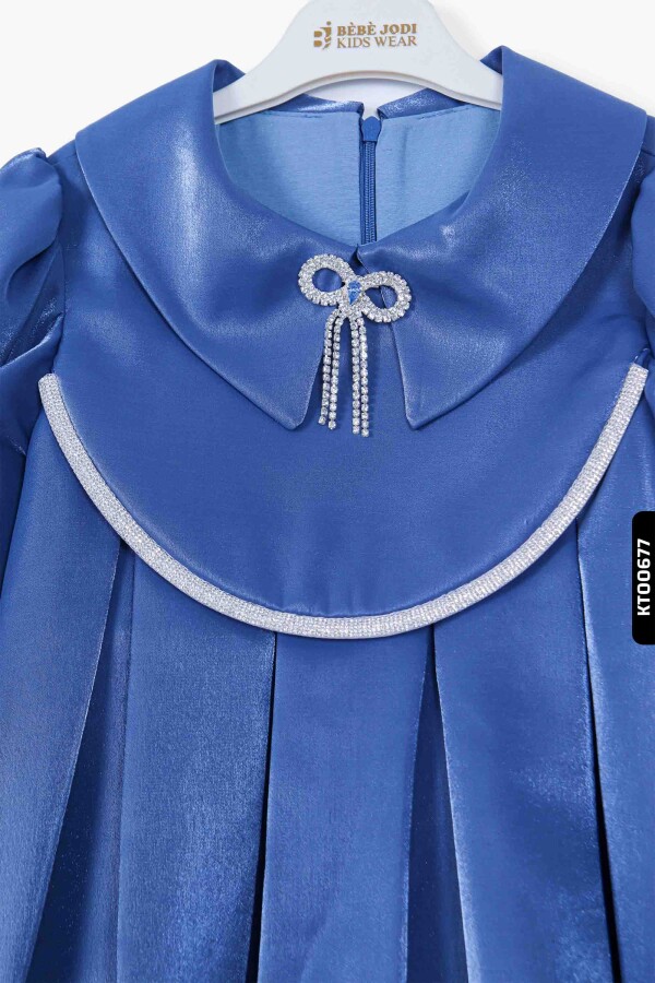 Devrik Yakalı Büzgü Kollu Katlanmış Kemersizli Kız Çocuk Elbise 3-10 Yaş 921 Mavi - 2