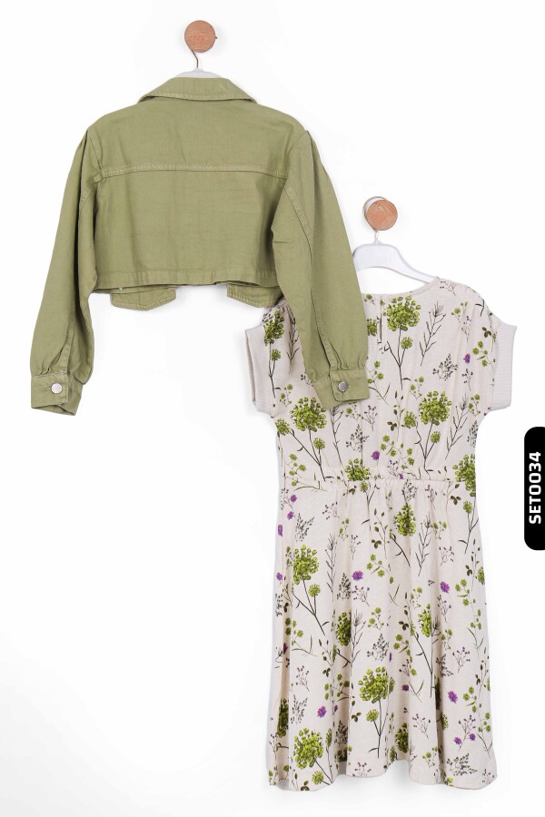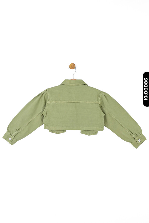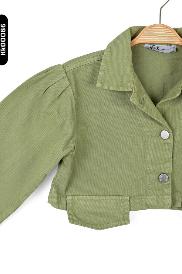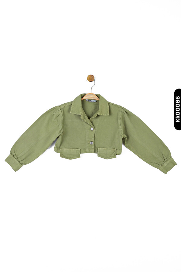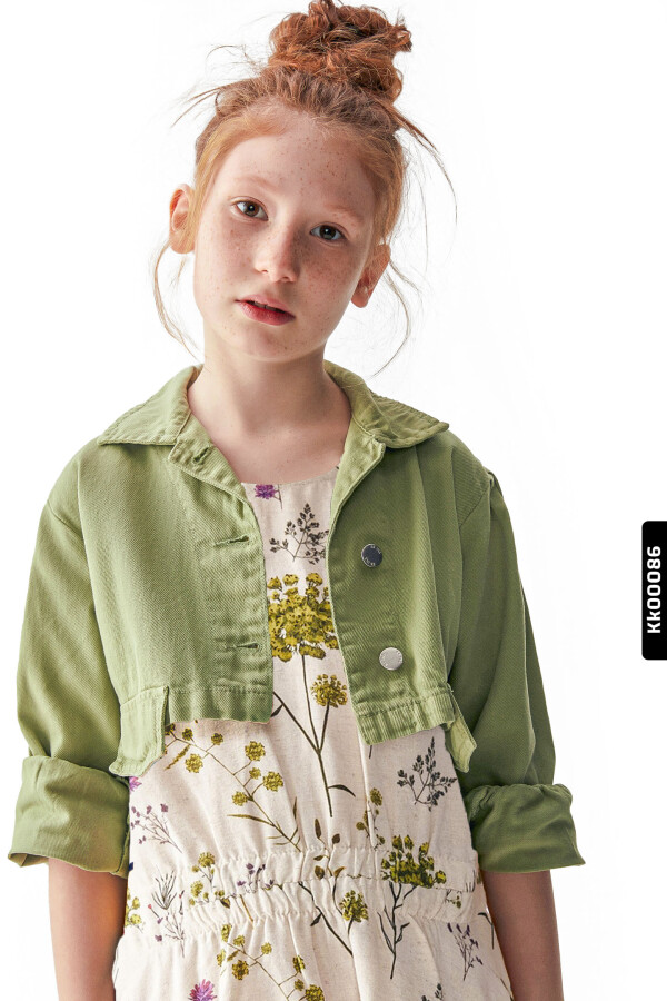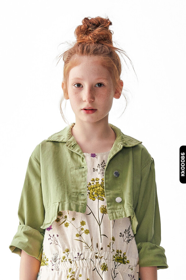 Bu yeşil kız çocuk ceketi, yaz ayları için ideal hafif ve şık bir dış giyim parçasıdır. Kapüşonsuz ve kısa boy tasarımıyla dikkat çeker. Ön kısmında iki adet metal düğme bulunmaktadır, fermuar veya kordon gibi aksesuarlar yoktur. Uzun kollu olan ceket, manşet kısmında hafif büzgü detayına sahiptir ve kolları rahatça kıvrılmıştır. Yakası klasik gömlek yaka stilindedir. Ceket, minimal cepler ve rahat kesimiyle hem günlük kullanım hem de özel anlar için uygundur.