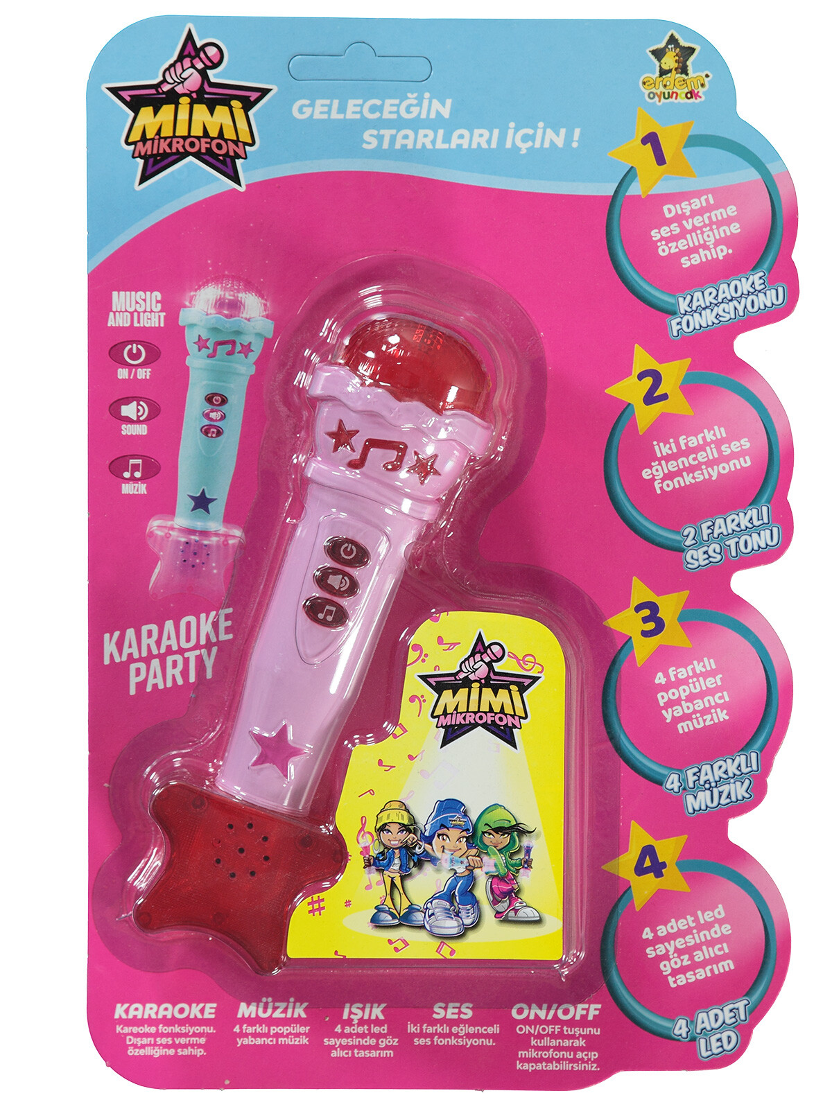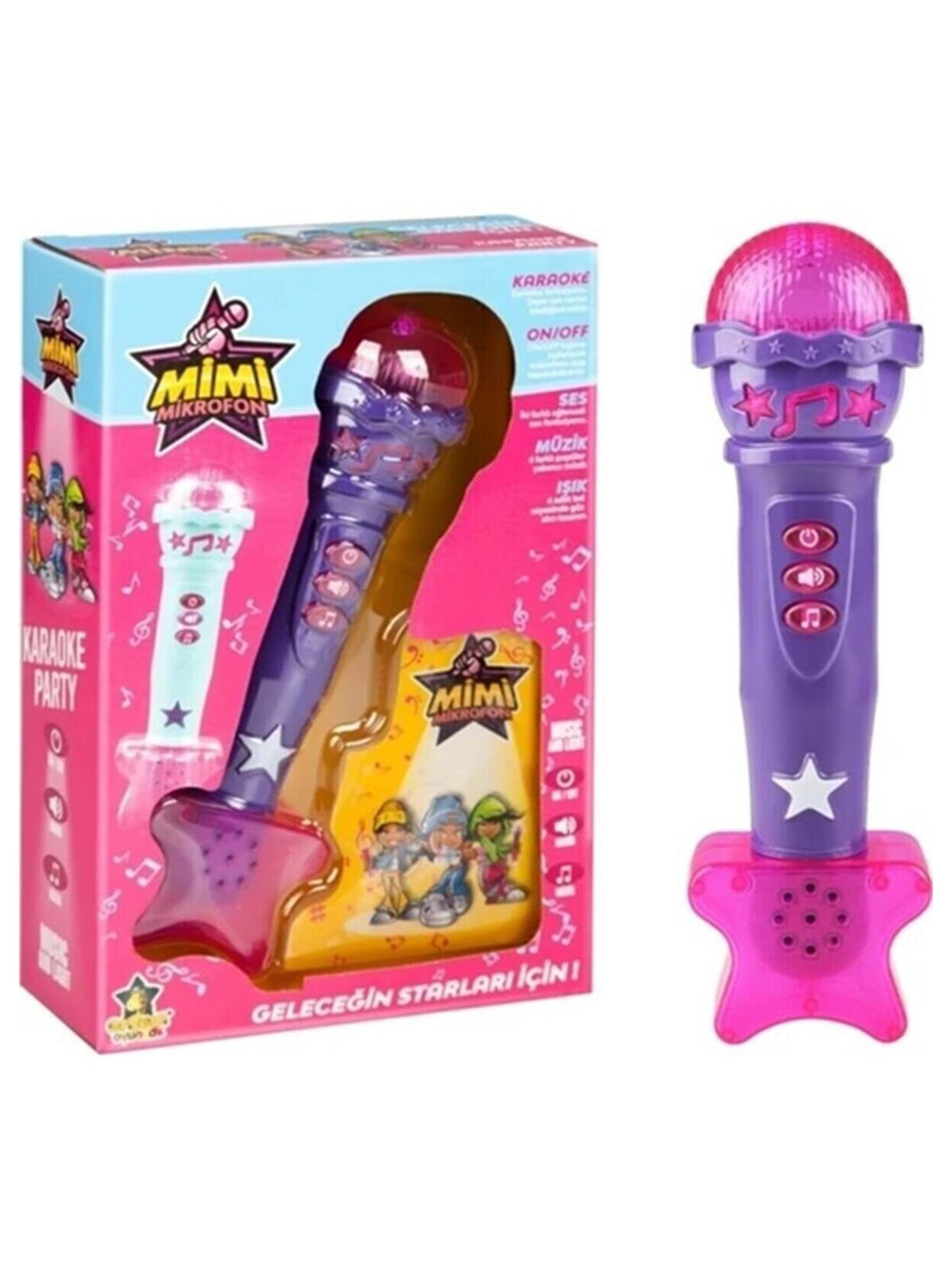 Ürünün 4 farklı rengi mevcuttur. Lütfen göndermemizi istediğiniz ürün rengini bize bildirin. Aksi halde stok durumuna göre herhangi bir renk gönderilecektir. Karaoke fonksiyonu Dışarı ses verme özelliğine sahip On-Off düğmesini kullanarak mikrofonu açıp kapatabilirsiniz. 2 farklı eğlenceli ses fonksiyonu 4 farklı popüler yabancı müzik 4 adet led sayesinde göz alıcı tasarım Yaş: 3+