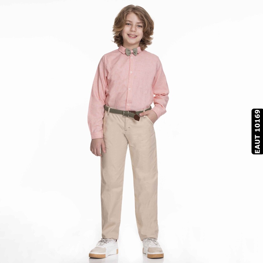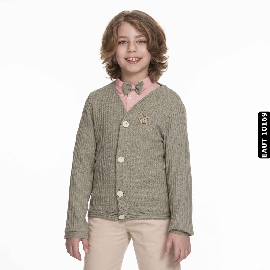 Notify me when its in stockThis stylish and comfortable two-piece set designed for boys is a perfect choice for the summer months. The set consists of a long-sleeved, button-down, V-neck cardigan, classic-cut beige trousers, and a pink shirt. The cardigan's knit details and small emblem on the front add an elegant touch, while the bow tie on the shirt completes the look. The relaxed fit and side pockets of the trousers make them suitable for everyday wear. This set offers both comfort and style for special occasions and everyday use.