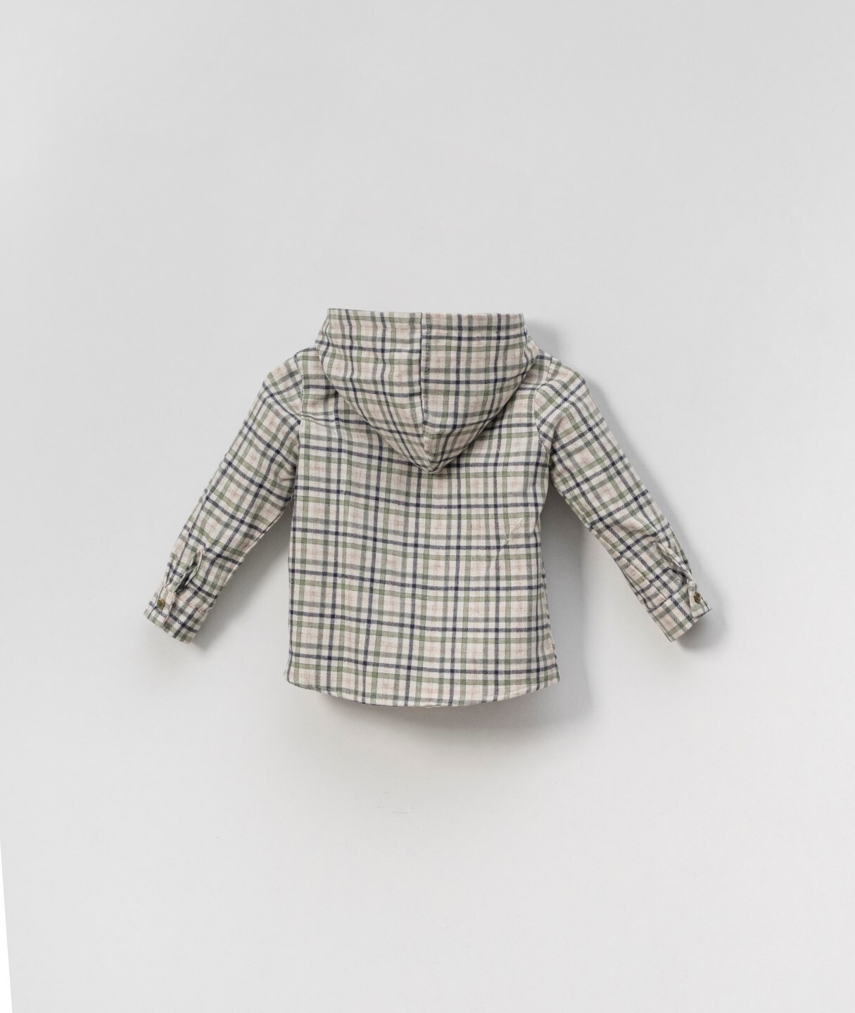 Bu Erkek Çocuk Alt Üst Takımı, kış ayları için şık ve rahat bir seçimdir. Üst parça, kapüşonlu ve fermuarlı haki renkli örgü hırkadan oluşur. Hırkanın altından, düğmeli ve kapüşonlu, haki ve ekru tonlarında kareli uzun kollu bir gömlek görünür. Takımın alt kısmı ise klasik kot pantolon şeklindedir. Kombin, çocukların hareket özgürlüğünü kısıtlamayan, modern ve casual bir tarz sunar.