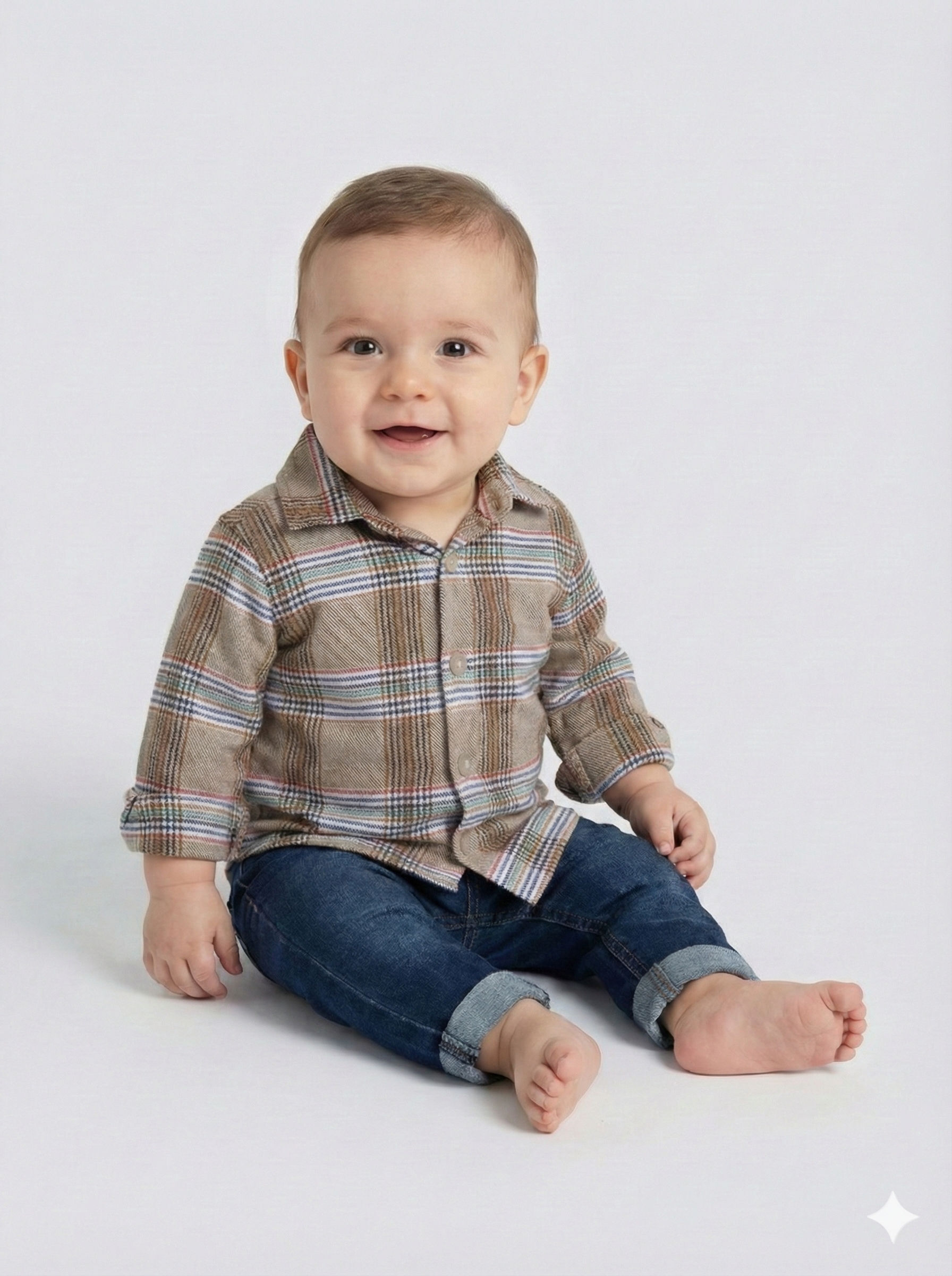 Gelince Haber VerBu erkek çocuk alt üst takımı, kış ayları için hem şık hem de rahat bir tercih sunuyor. Bej tonlarında olan takımda, kapüşonlu ve düğmeli bir hırka ile kahverengi ağırlıklı ekose desenli uzun kollu gömlek yer alıyor. Hırkanın yanlarında cepler bulunuyor ve örgü detayları ile sıcak ve samimi bir görünüm sağlanıyor. Takımın altı ise klasik mavi kot pantolon olup, paçaları kıvrık şekilde tasarlanmış. Günlük kullanımda çocukların hareket özgürlüğünü kısıtlamayan, aynı zamanda tarz sahibi kombinler yaratmak isteyen ebeveynler için ideal bir set.