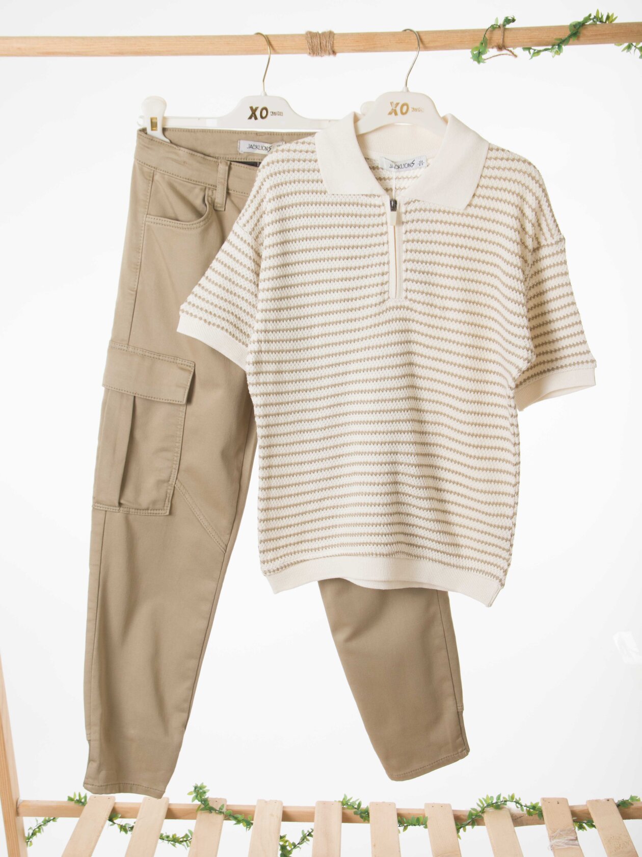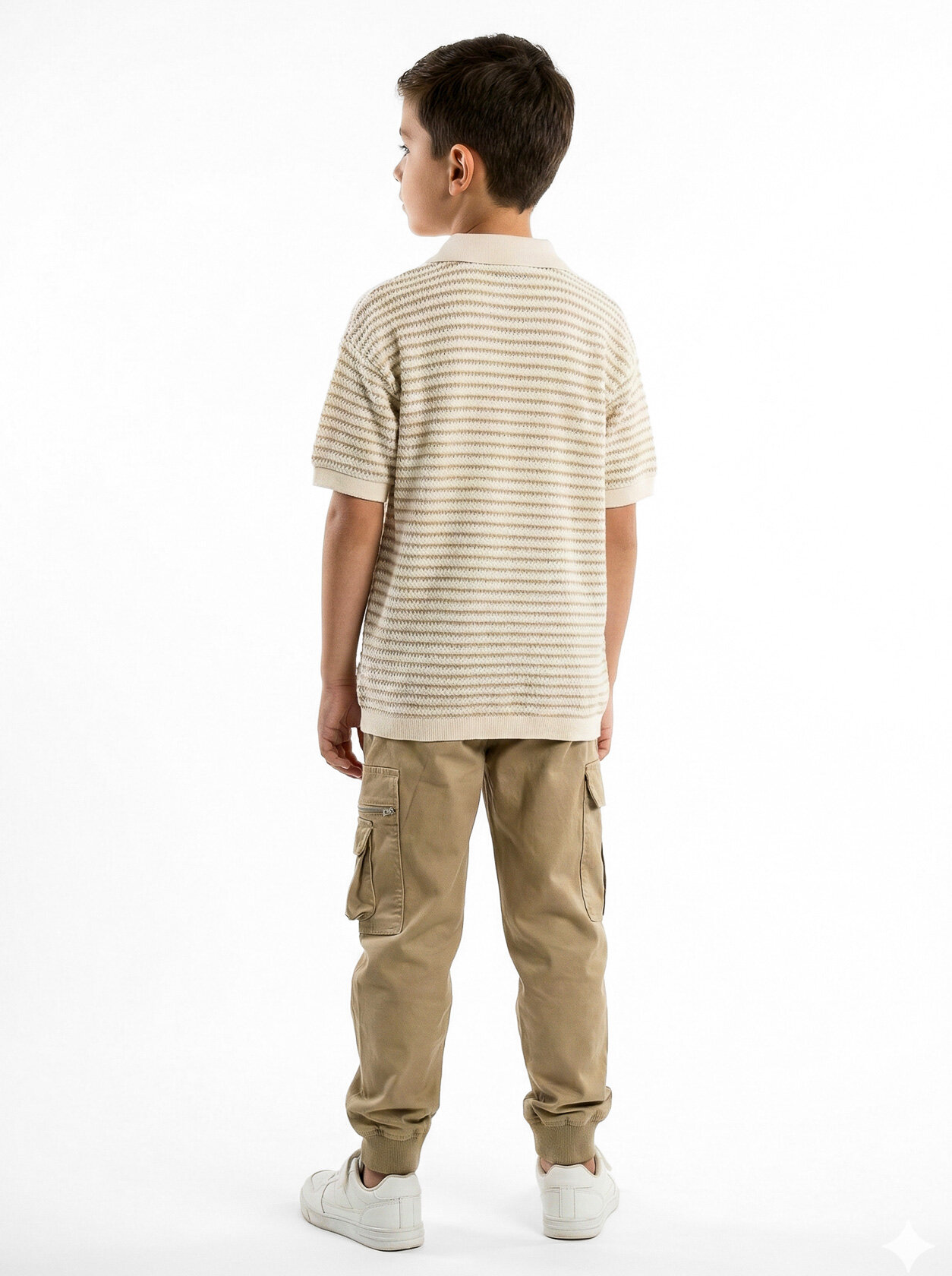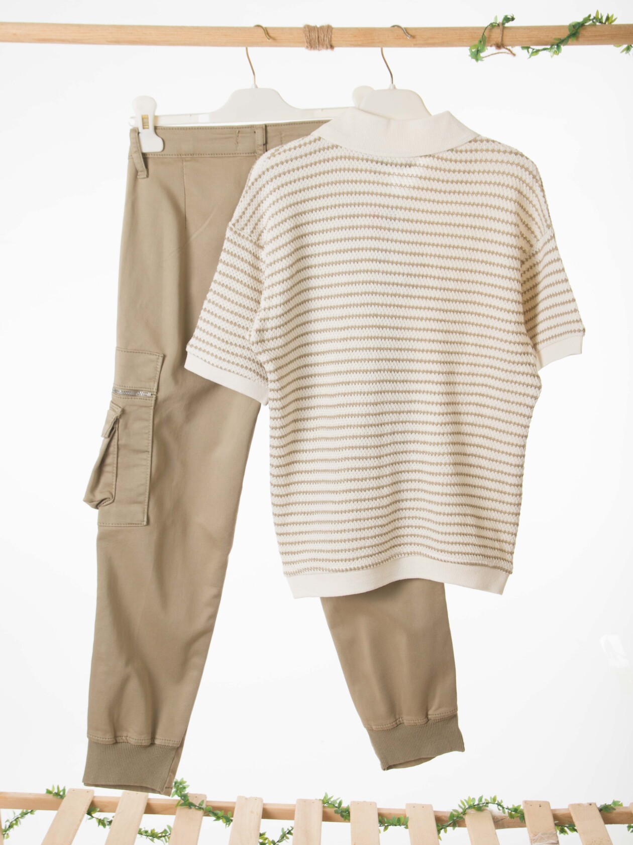 Erkek çocuk için tasarlanmış rahat ve günlük kullanıma uygun bir kombin takımı. Takımda mavi ve gri tonlarında renkler hakimdir. Üst parça kapüşonlu olup, önünde fermuarlı kapama vardır. Uzun kollu ve bisiklet yaka özellikleriyle dikkat çeker. Alt parça diz hizasında, rahat kesim pantolondur. Kumaş dokusu yumuşak ve hafif esnek görünmektedir. Takım spor ve günlük aktiviteler için idealdir.