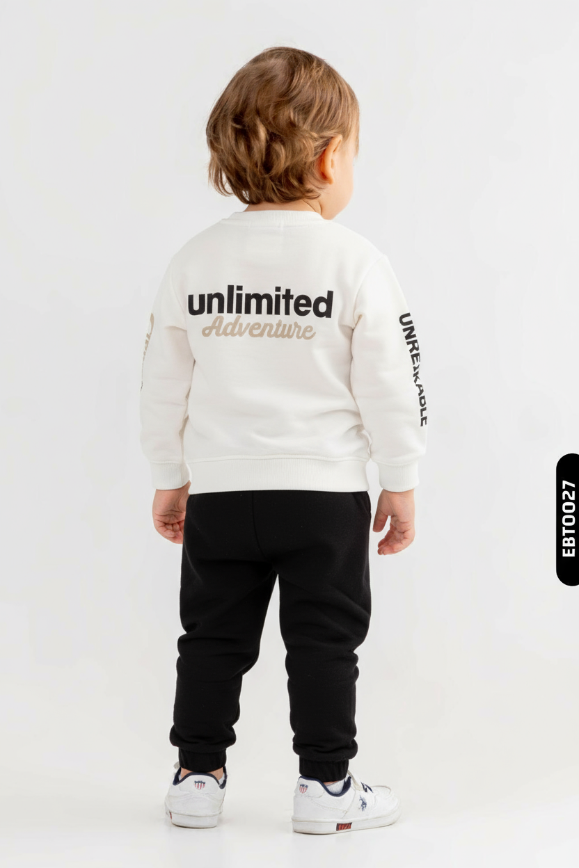 Erkek çocuklar için tasarlanmış sportif ve rahat bir kombin takımı. Takım, koyu lacivert renkte olup kapüşonlu üst ve uzun paçalı alt pantolondan oluşmaktadır. Üstte fermuar kapamalı bir mont yer almakta, iki yan cep bulunmaktadır. Üst kısmın manşetleri ve alt paçalar lastiklidir. Kumaş yapısı yumuşak ve hafif tüylü görünmektedir. Kombin, günlük kullanım ve dış mekan aktiviteleri için uygundur.
