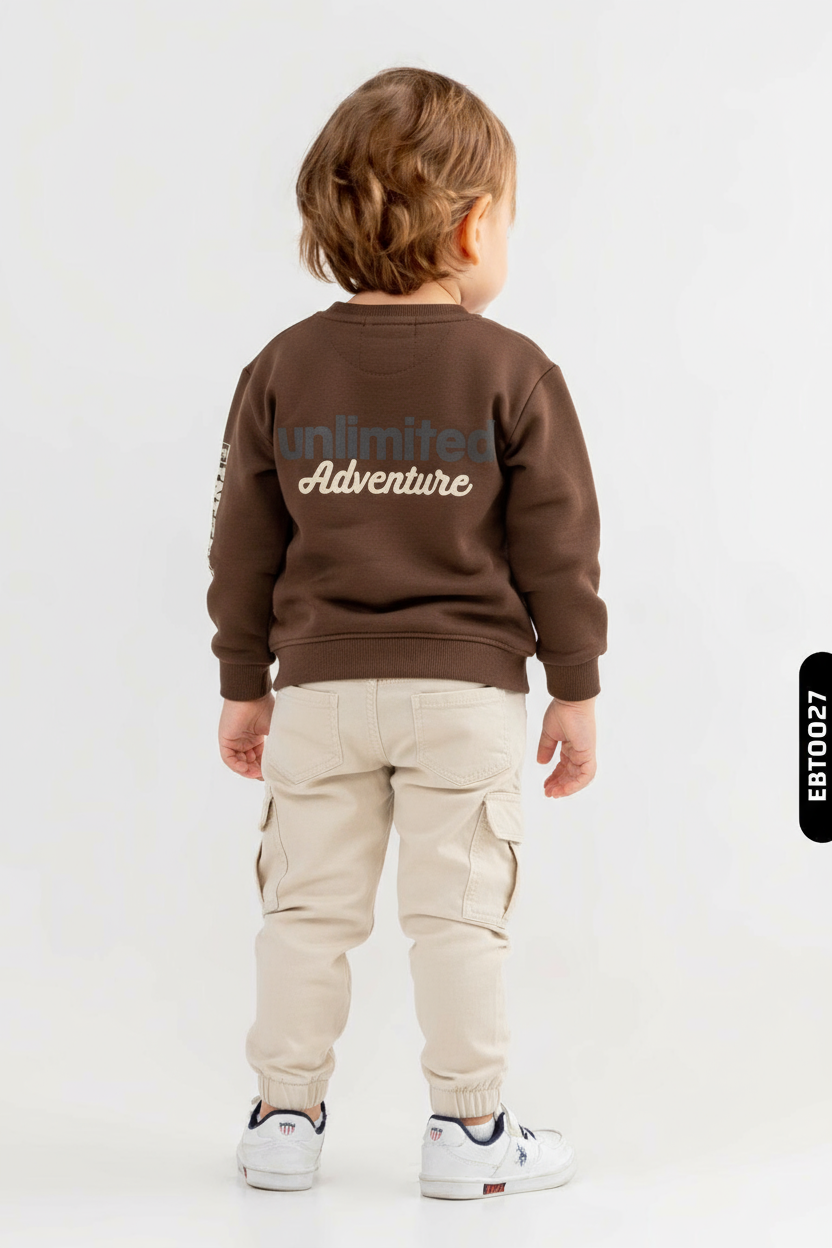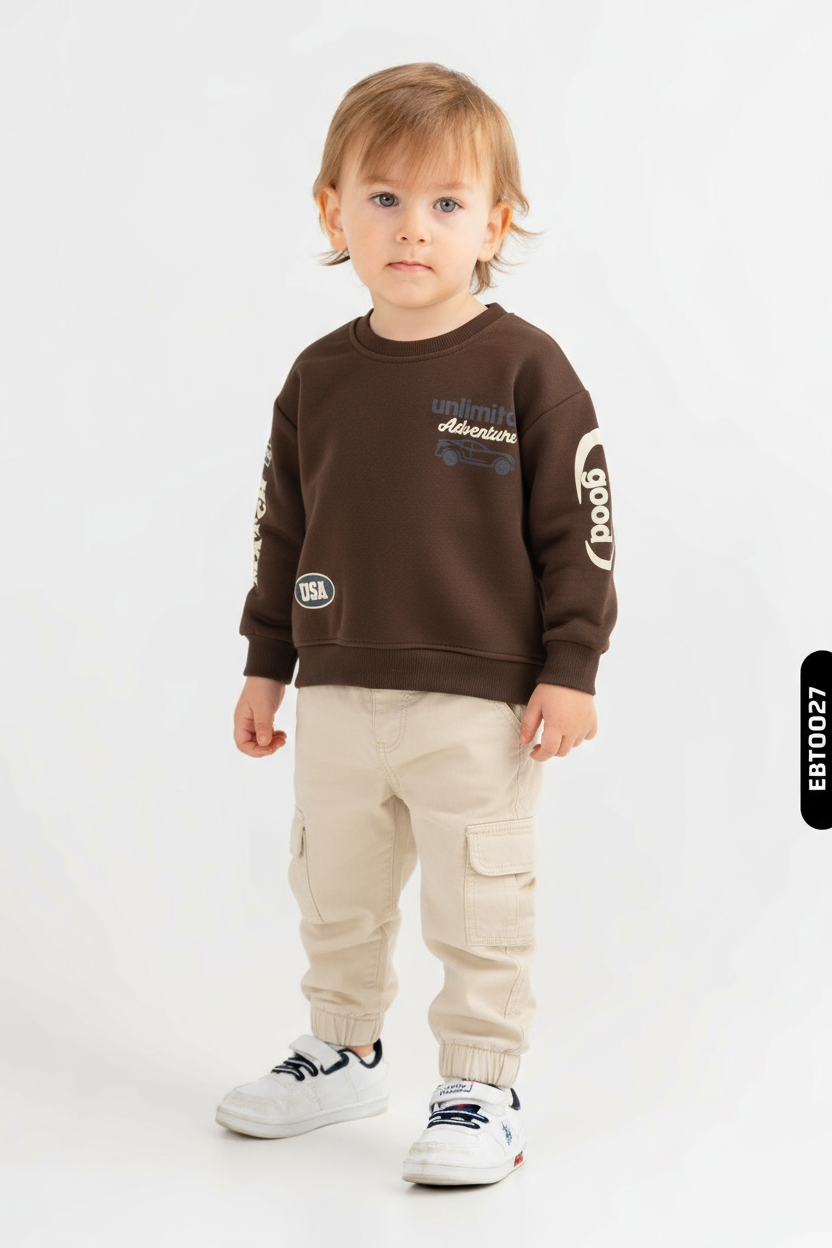 مجموعة ملابس للأطفال من الذكور تتميز بالراحة والعملية. الجزء العلوي بدون كابوشون ويغلق بسحّاب وله أكمام طويلة. الياقة دائرية. تحتوي المجموعة على جيوب ولا تحتوي على أربطة أو إكسسوارات إضافية. نسيج القماش أملس وبسيط. الألوان الرئيسية هي الأزرق الداكن والرمادي. تناسب الاستخدام اليومي والرياضي.