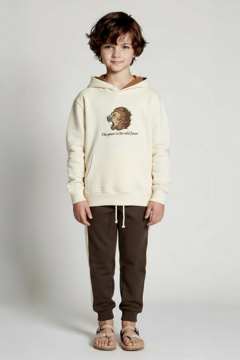 طقم مكون من قطعتين للأولاد يوفر الراحة والأناقة للاستخدام اليومي. يتميز الطقم بألوان زرقاء وزرقاء داكنة حيوية تعطي مظهراً رياضياً. القطعة العلوية مزودة بغطاء للرأس (هود) وسحاب للإغلاق وأكمام طويلة. القطعة السفلية عبارة عن بنطلون رياضي بقصة مستقيمة. تحتوي القطعة العلوية على جيوب وأربطة قابلة للتعديل، مما يجعلها عملية ومريحة. النسيج ناعم وقابل للتهوية. تفاصيل مخططة ومطبوعة تضيف لمسة حيوية للتصميم.