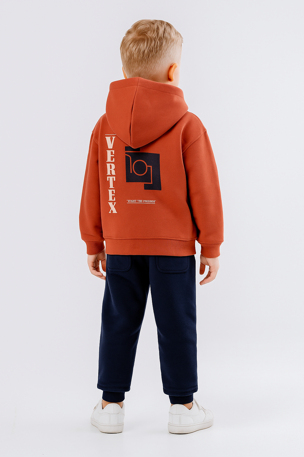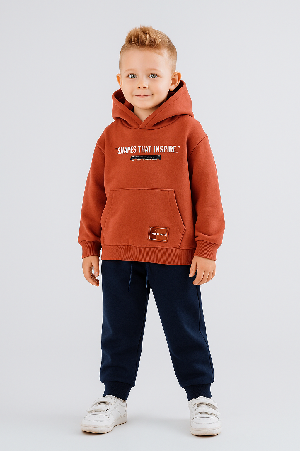 طقم ملابس للأطفال من الأولاد يتميز بتصميم مريح وعملي. الأعلى بأكمام طويلة مع قبعة وإغلاق بسحاب وجيوب جانبية. البنطال بحزام خصر مطاطي وجيوب وقصة مريحة. القماش يبدو ناعماً مع ملمس فليس خفيف. مناسب للارتداء اليومي والأنشطة الرياضية.