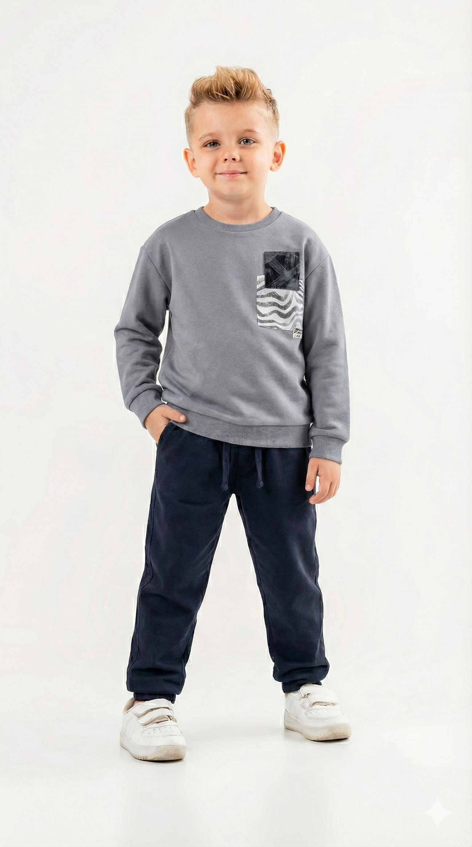 طقم مريح وعصري للأطفال الأولاد، مناسب للاستخدام اليومي والرياضي. الجزء العلوي يحتوي على قبعة، سحاب للإغلاق، وأكمام طويلة. يحتوي على جيوب وحزام برباط لسهولة التعديل. التصميم بسيط بألوان موحدة ونقوش خفيفة.