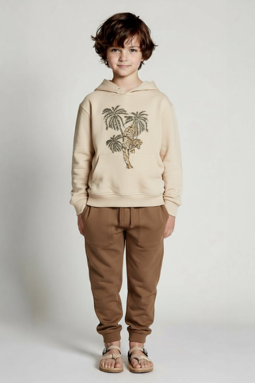 هذا الطقم للأطفال من الأولاد مخصص للاستخدام اليومي والكاجوال. يتضمن قميص بأكمام قصيرة وياقة دائرية مع سويت شيرت بقبعة وأكمام طويلة مع سحاب للإغلاق. اللون الغالب هو الأزرق الداكن، بتصميم بسيط وأنيق. السويت شيرت يحتوي على جيوب وأربطة، مما يعكس أسلوب رياضي وعصري.