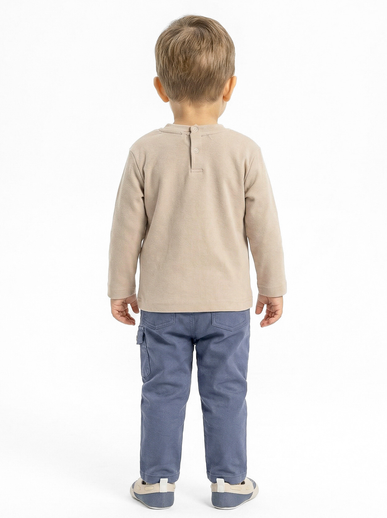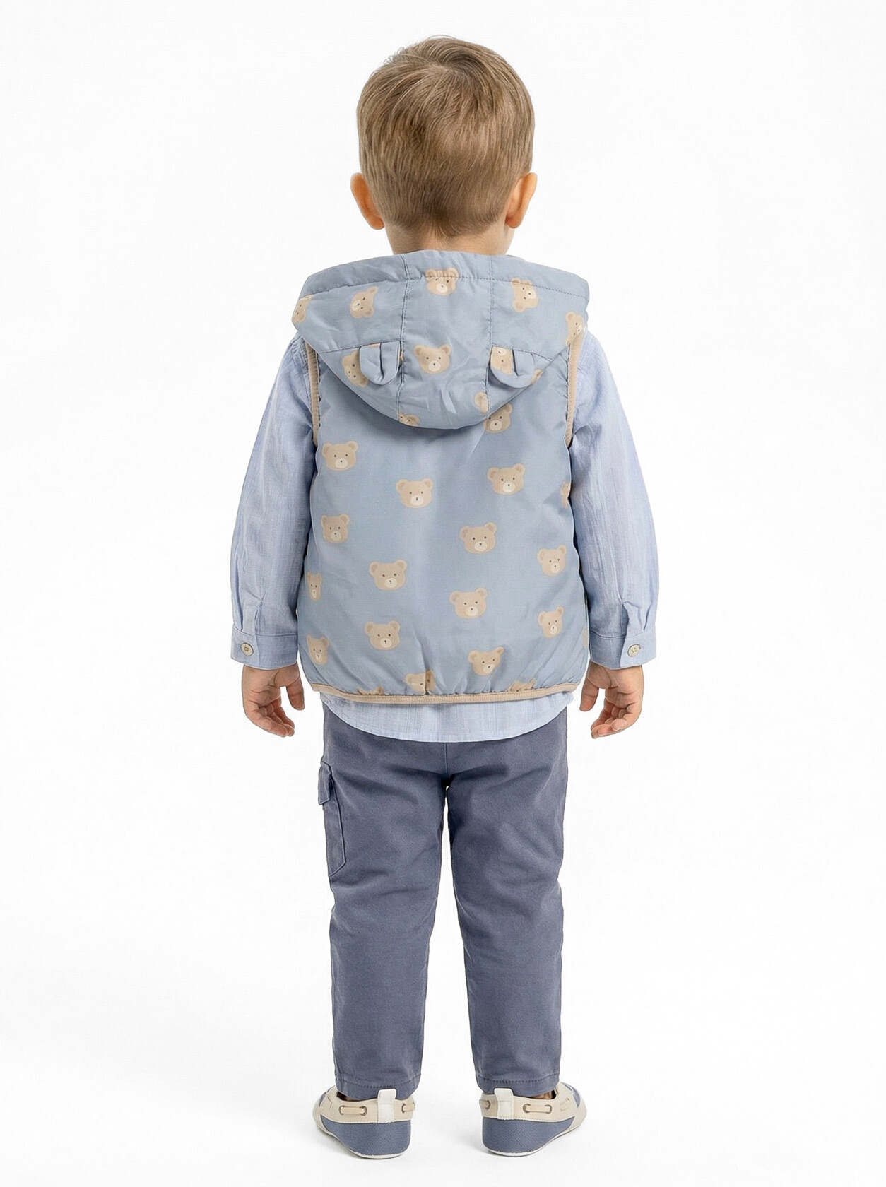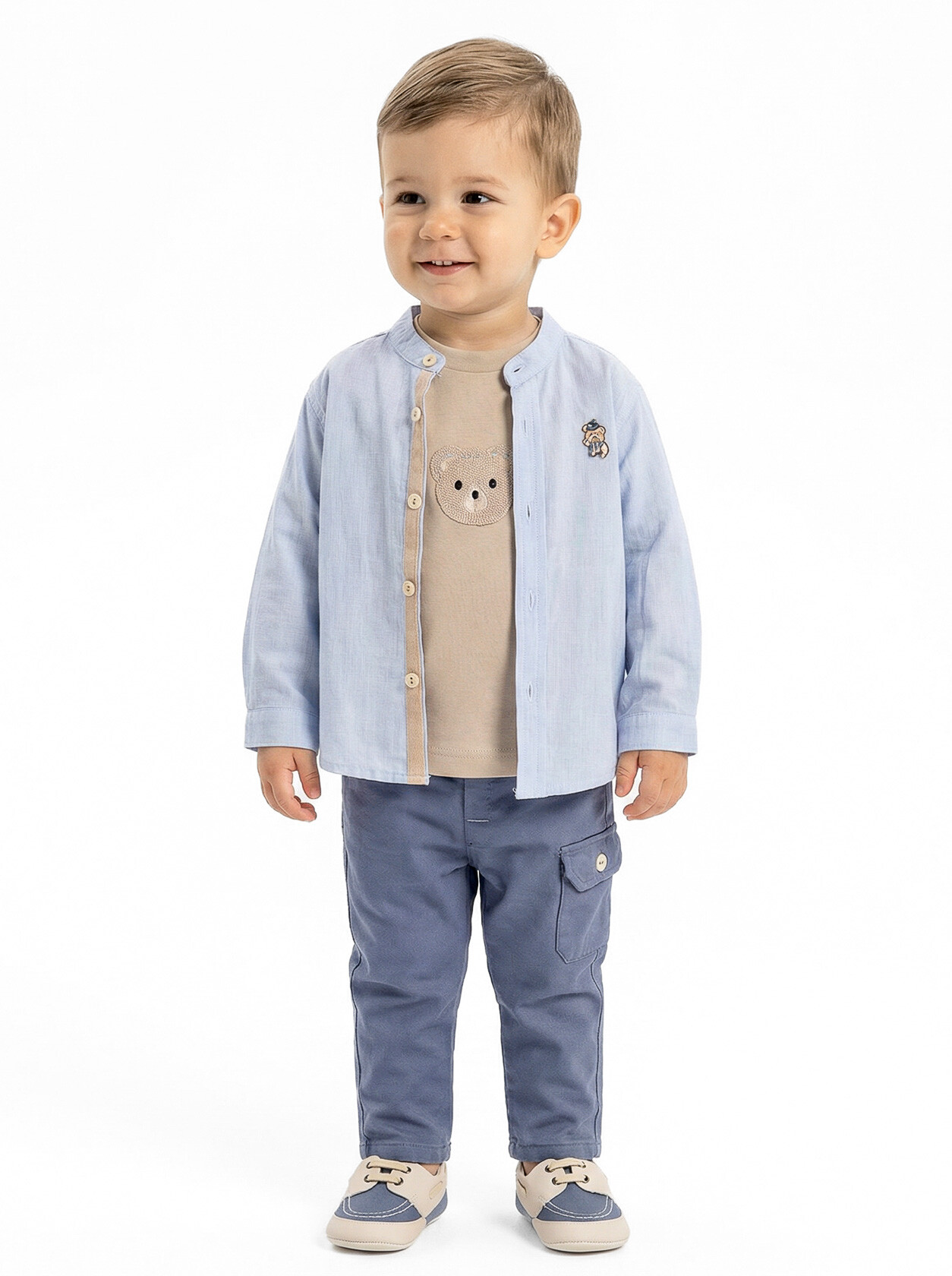 Erkek çocuklar için bahar sezonuna özel tasarlanmış şık ve rahat alt üst takımı. Takım, sevimli ayıcık desenleriyle süslenmiş kapüşonlu yelek, düğmeli uzun kollu gömlek ve cep detaylı pantolondan oluşmaktadır.