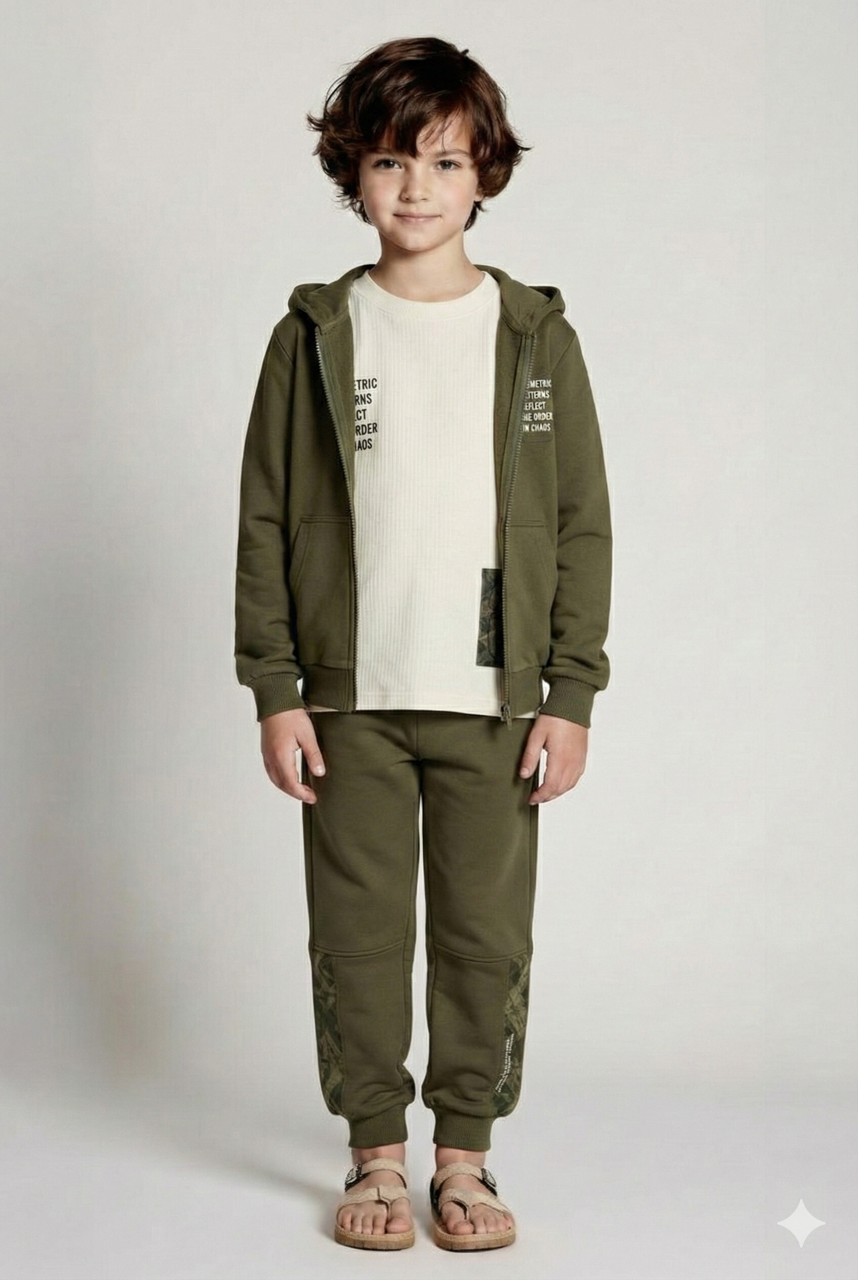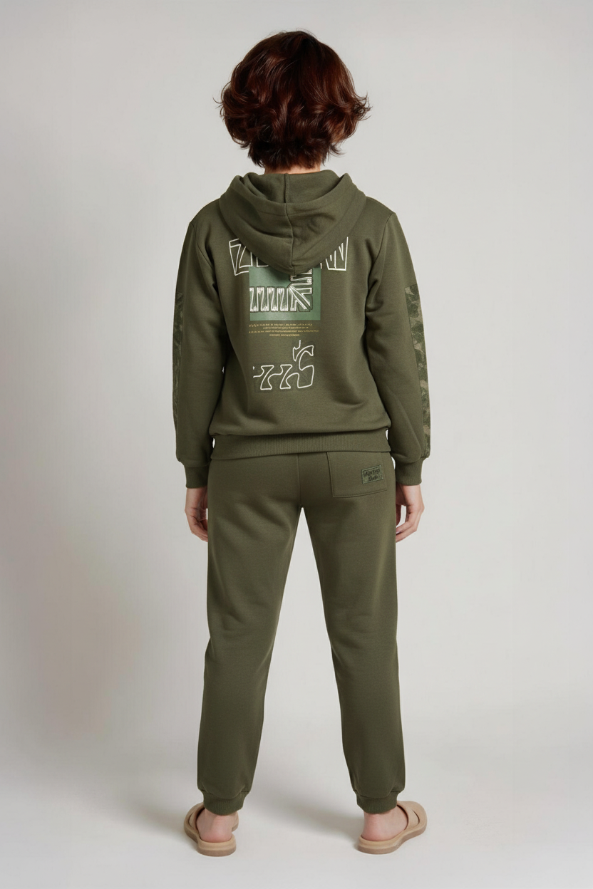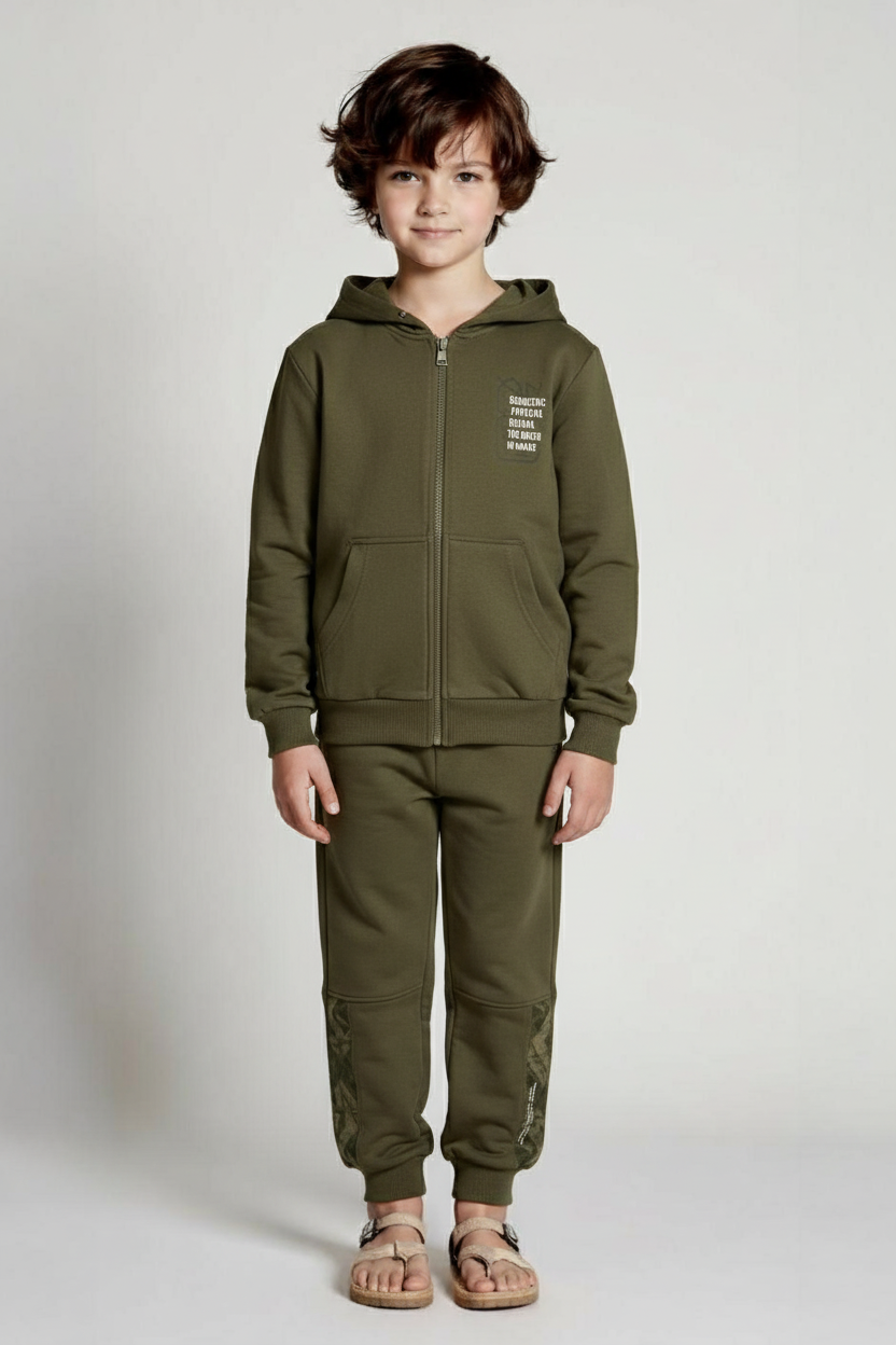 طقم ملابس للأولاد مناسب للاستخدام اليومي والكاجوال. يتكون من سترة بأكمام طويلة مع قبعة وإغلاق بسحّاب وبنطال رياضي مريح. السترة باللون الأزرق الداكن مع قبعة لحماية إضافية من البرد. يحتوي الطقم على جيوب في الأعلى والأسفل، والبنطال مزود بحبل للتعديل على الخصر. النسيج يبدو ناعمًا وناعم الملمس. الطقم بأسلوب رياضي وكاجوال مثالي لأنشطة الأطفال اليومية.