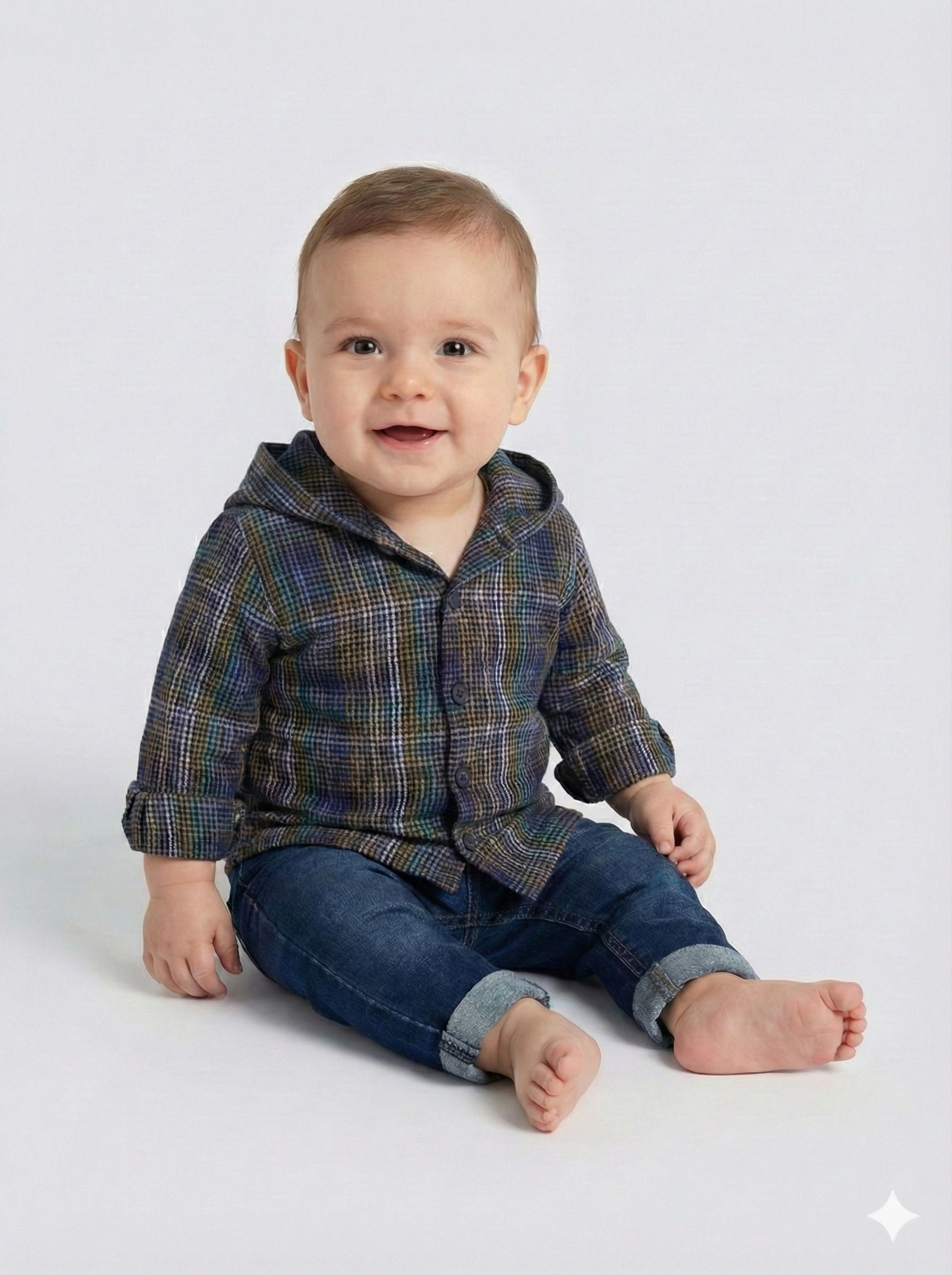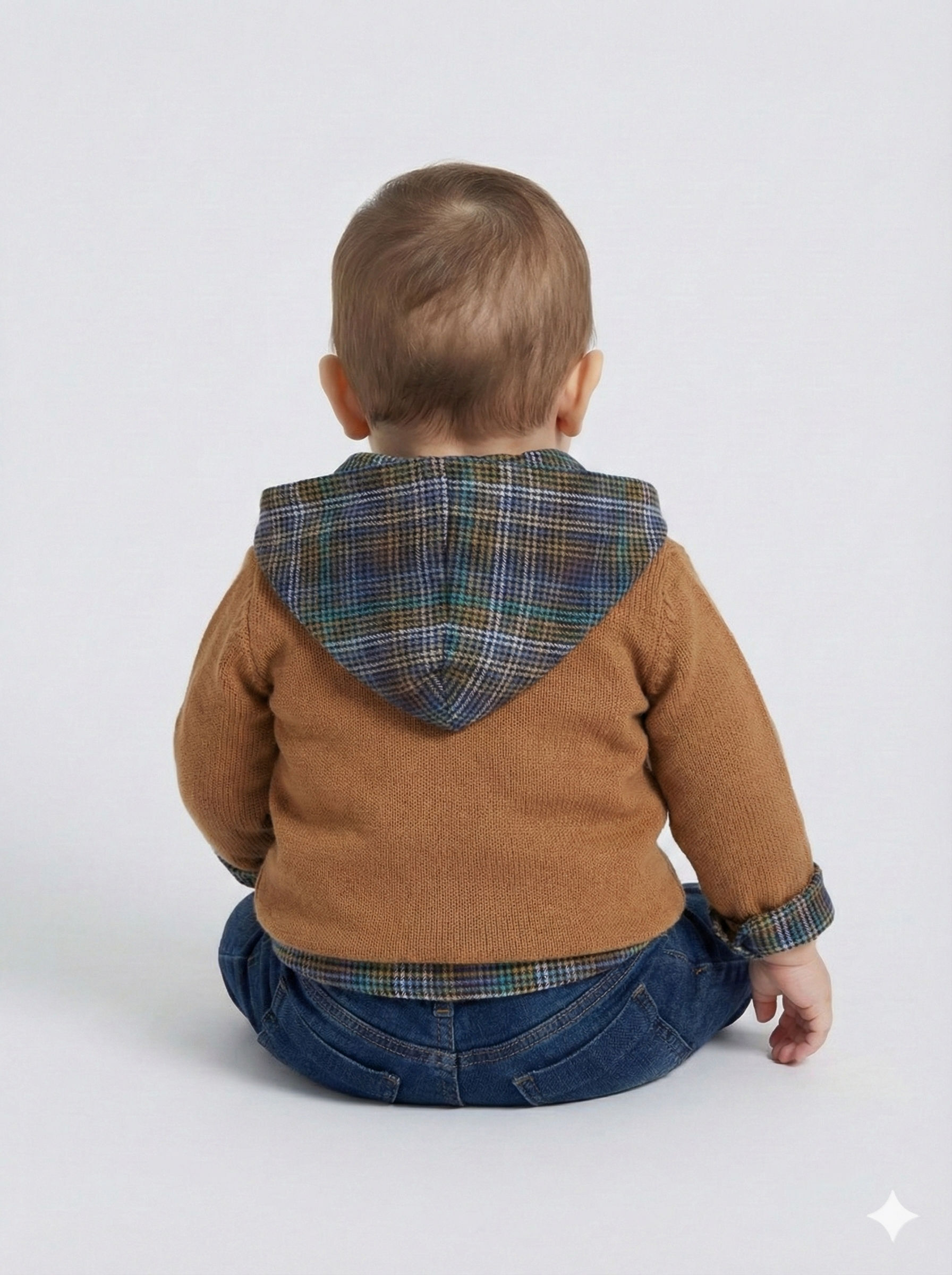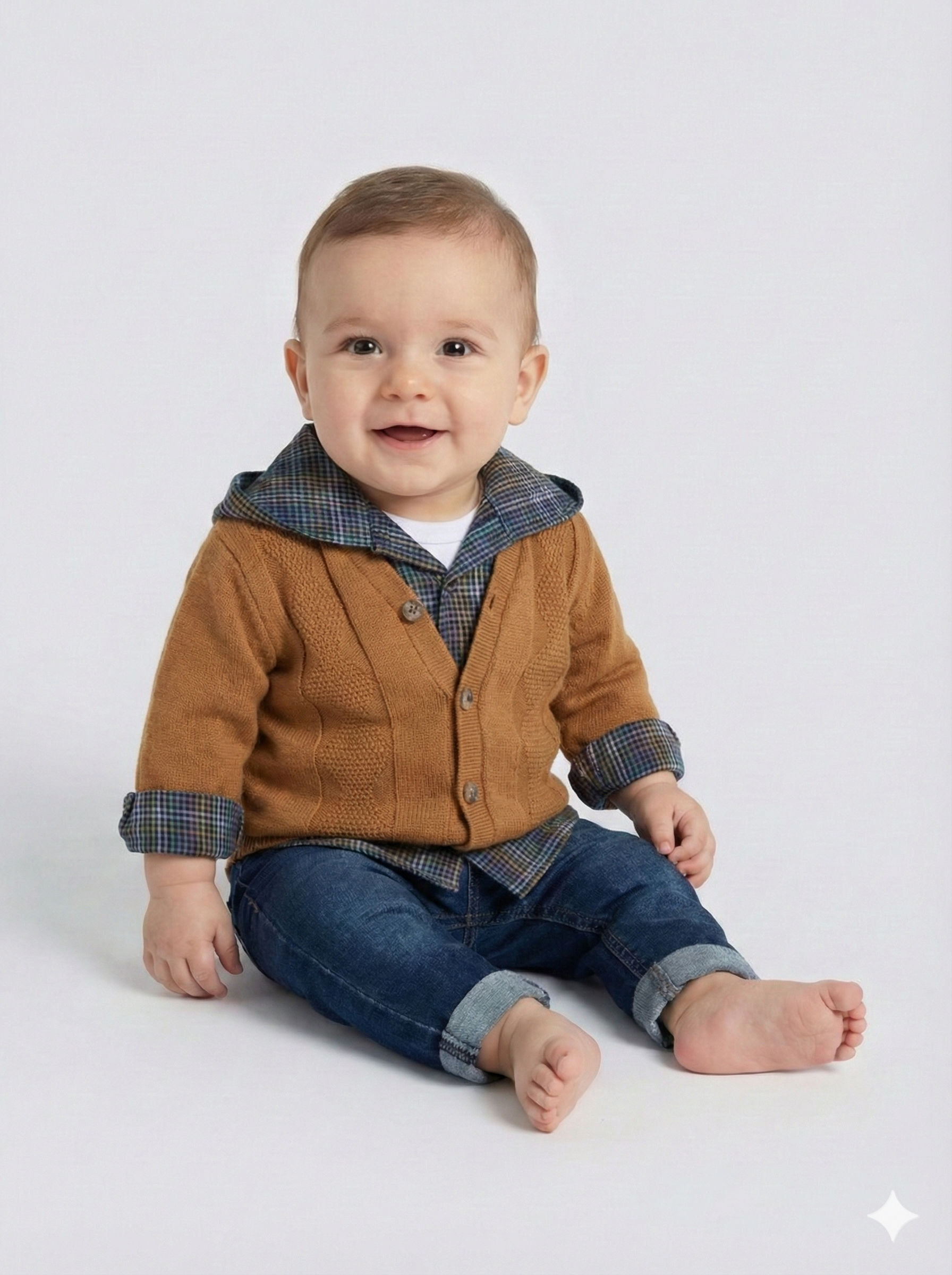 Bu şık erkek çocuk alt üst takımı, kış mevsimi için ideal bir seçimdir. Takımda, hardal renkte, düğmeli ve uzun kollu bir hırka bulunur. Hırkanın kapüşonu, mavi, yeşil ve hardal tonlarını içeren ekose desenli kumaştan yapılmıştır. İçinde ise aynı ekose desene sahip, düğmeli ve kapüşonsuz uzun kollu bir gömlek yer alır. Alt ise klasik kot pantolon tarzında, paçaları katlanmış ve rahat bir kesime sahiptir. Takımın kombinasyonu, hem günlük hem de özel günlerde kullanıma uygun, rahat ve şık bir görünüm sunar.