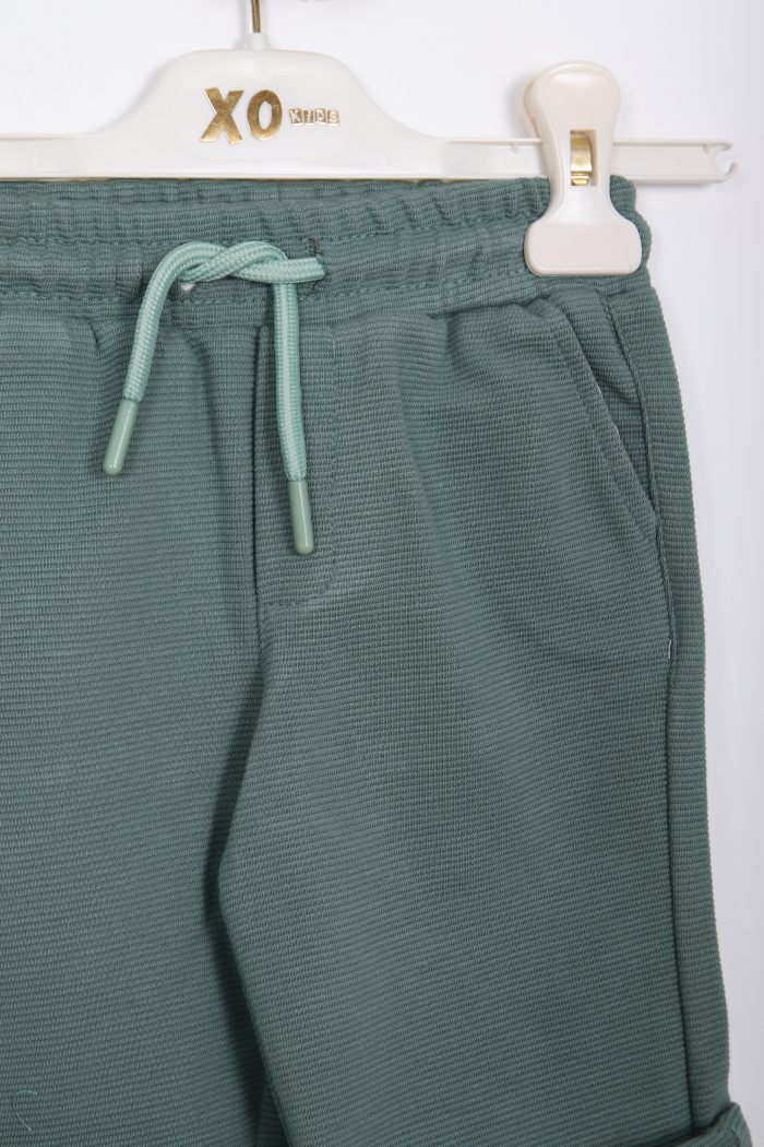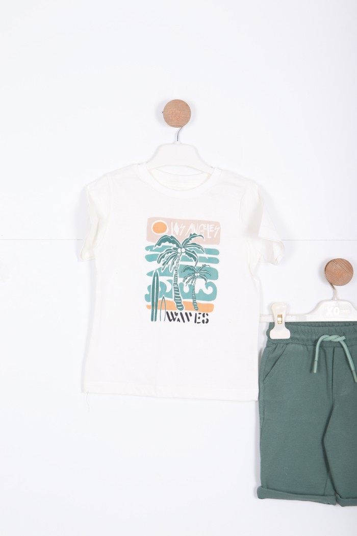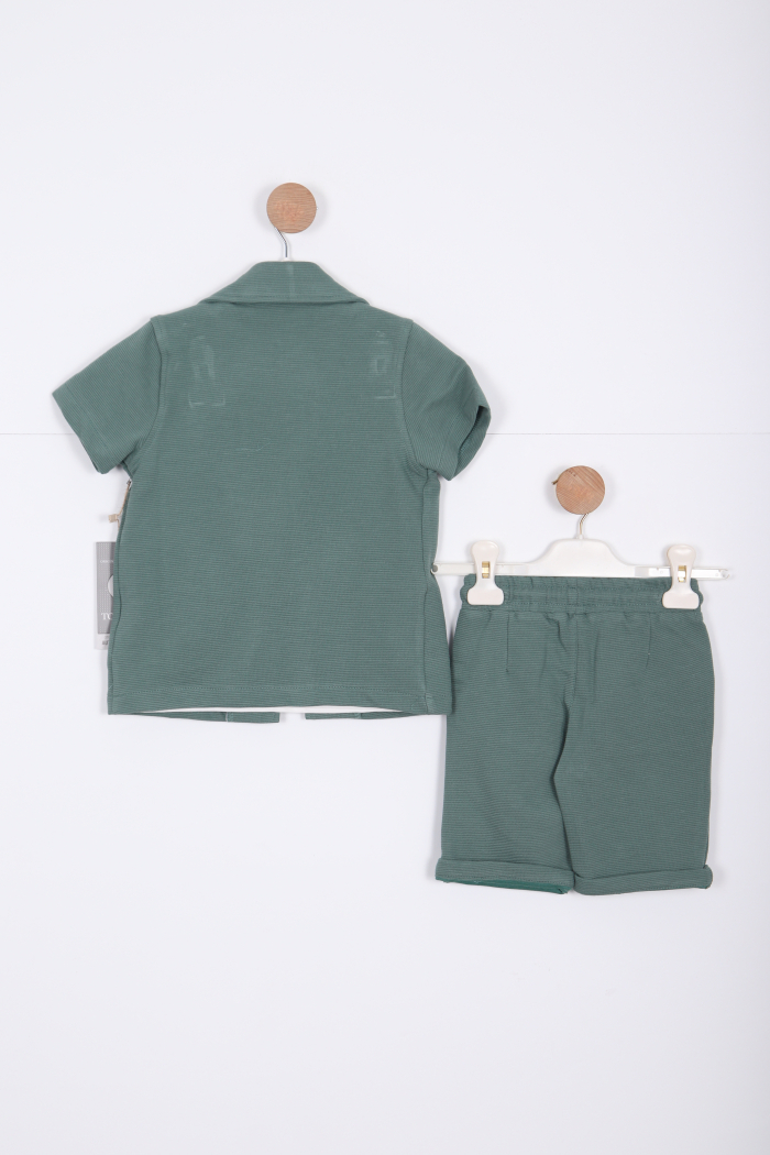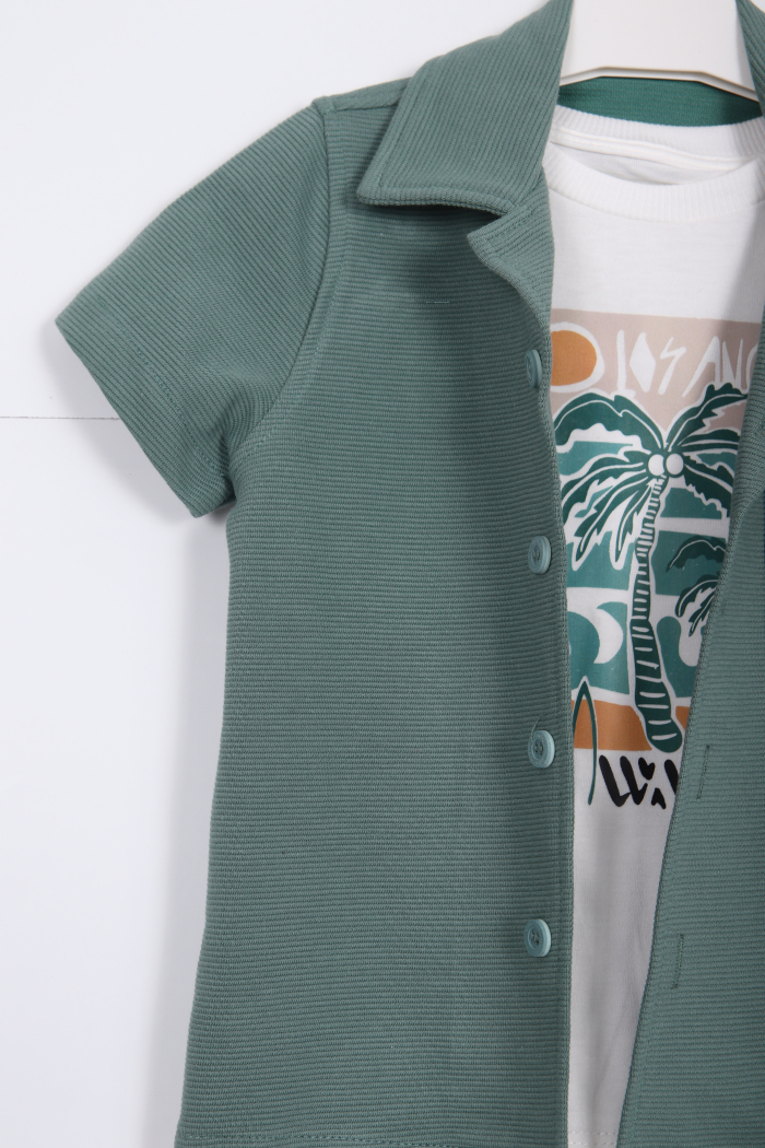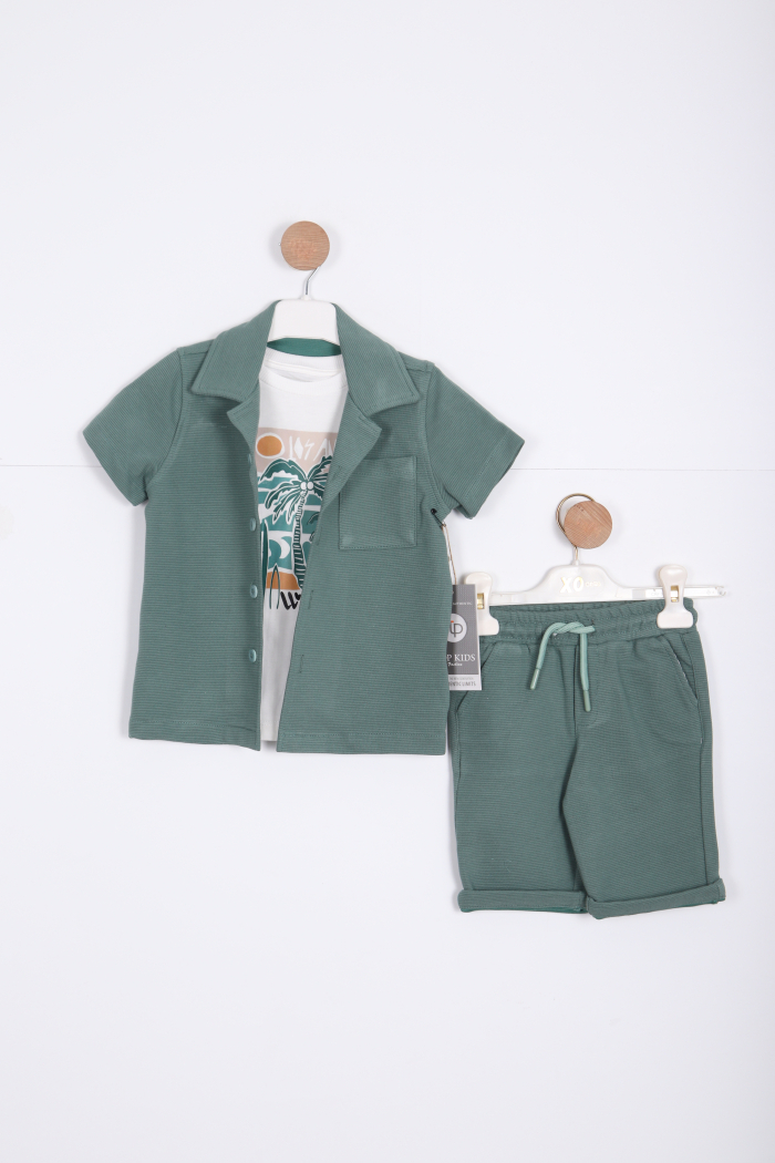 Bu erkek çocuk alt üst takımı, rahatlığı ve şıklığı bir arada sunan ideal bir yazlık set. Takım, yeşil tonlarda tasarlanmış ve kısa kollu bir gömlek ile diz üstü şorttan oluşuyor. Gömlek düğmeli ve yaka detaylı olup, önünde küçük bir cep bulunuyor. İçinde ise beyaz renkli, palmiye ağacı baskılı bisiklet yakalı bir tişört yer alıyor. Şort, elastik bel ve bağcıklı kordon detayı ile çocukların hareket özgürlüğünü desteklerken, iki yan cep fonksiyonel kullanım sağlıyor. Takımın dokusu hafif ve nefes alabilir yapıda, çocukların rahatça kullanabileceği şekilde tasarlanmıştır.