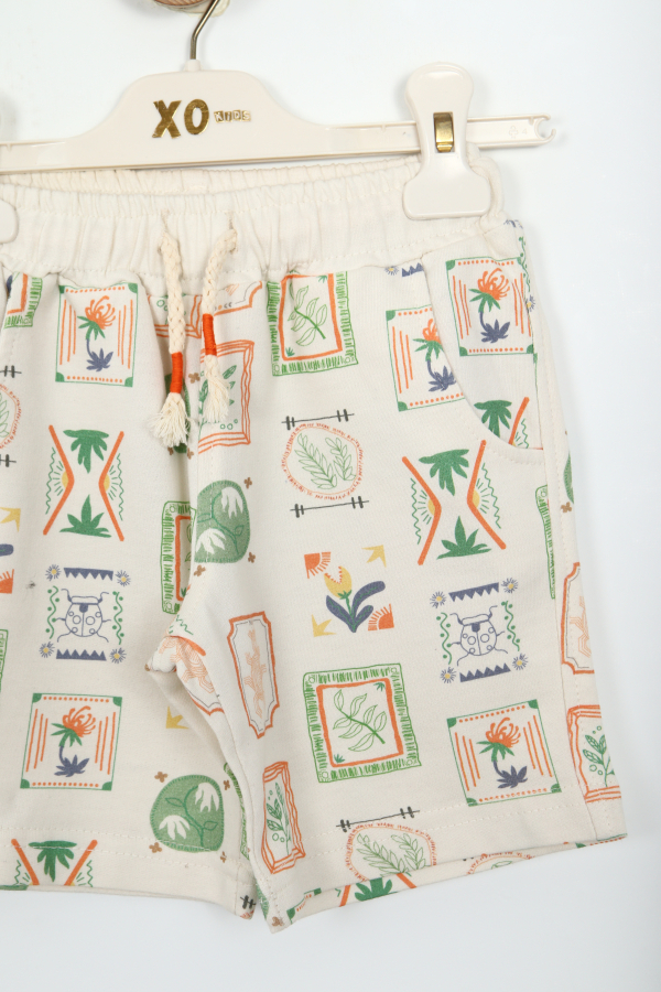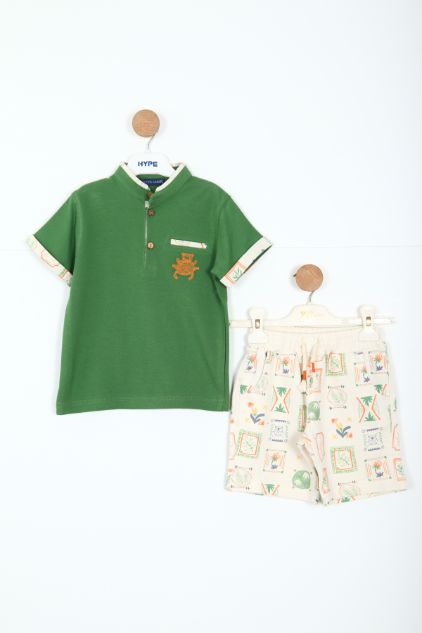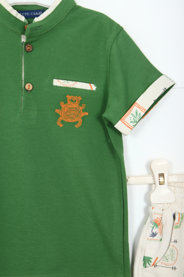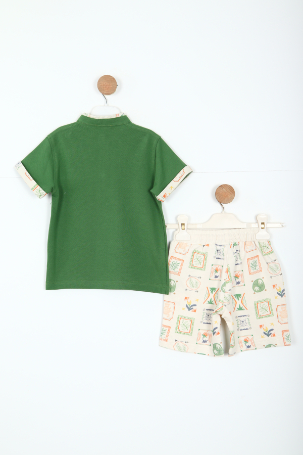 Bu erkek çocuk alt üst takımı, yaz ayları için mükemmel bir seçimdir. Kısa kollu, yeşil renkteki üst, bisiklet yaka ve düğmeli ön kısmıyla rahat ve şık bir görünüm sunar. Üstteki küçük cep ve kol kenarındaki desenli detaylar dikkat çekicidir. Alt ise ekru zemin üzerine yeşil, turuncu ve mavi renklerde doğa temalı baskılarla süslenmiştir. Lastikli ve kordonlu bel yapısı sayesinde çocukların rahat hareket etmesini sağlar. Hem günlük kullanıma hem de özel günlere uygun, sportif ve rahat bir kombin sunar.