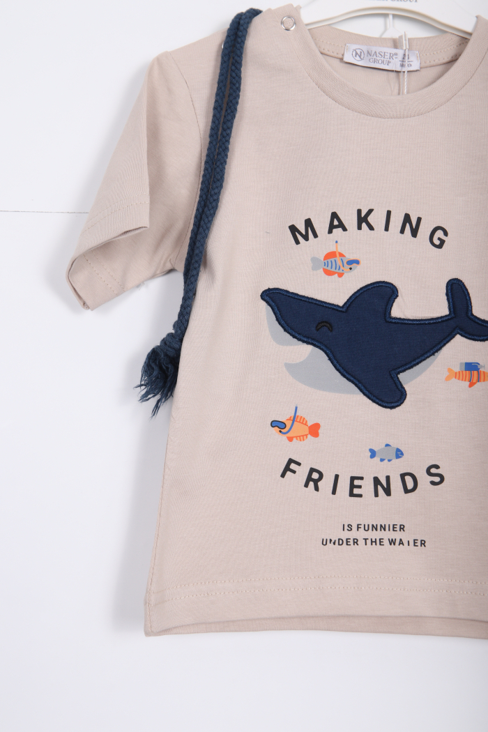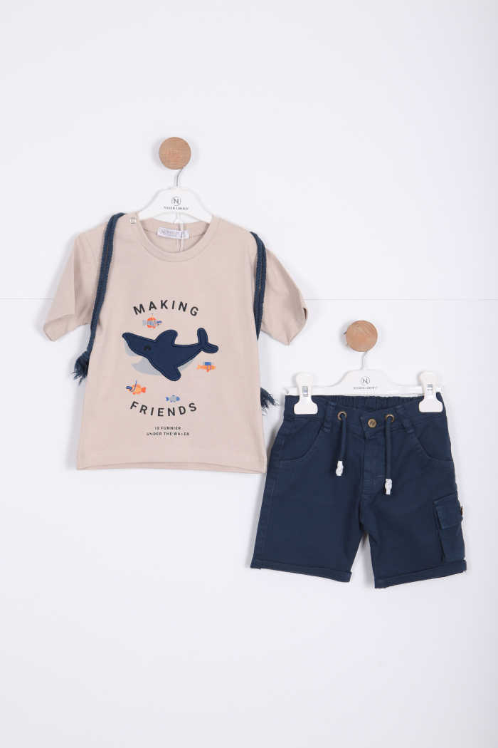 Bu erkek çocuk şort takımı, yaz ayları için mükemmel bir seçimdir. Bej tonlarında kısa kollu tişört, "MAKING FRIENDS" yazısı ve sevimli bir balina desenine sahiptir. Şort kısmı ise koyu mavi ile şıklık katıyor. Esnek bel bandı ve yan cepleri, rahat bir kullanım sunar.