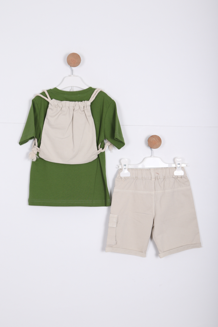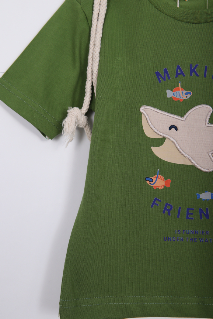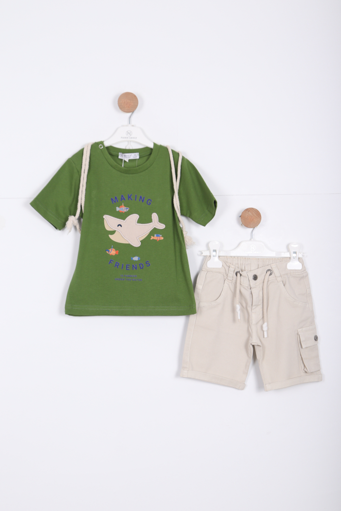 Bu erkek çocuk şort takımı, yaz ayları için mükemmel bir seçimdir. Bej tonlarında kısa kollu tişört, "MAKING FRIENDS" yazısı ve sevimli bir balina desenine sahiptir. Şort kısmı ise koyu mavi ile şıklık katıyor. Esnek bel bandı ve yan cepleri, rahat bir kullanım sunar.