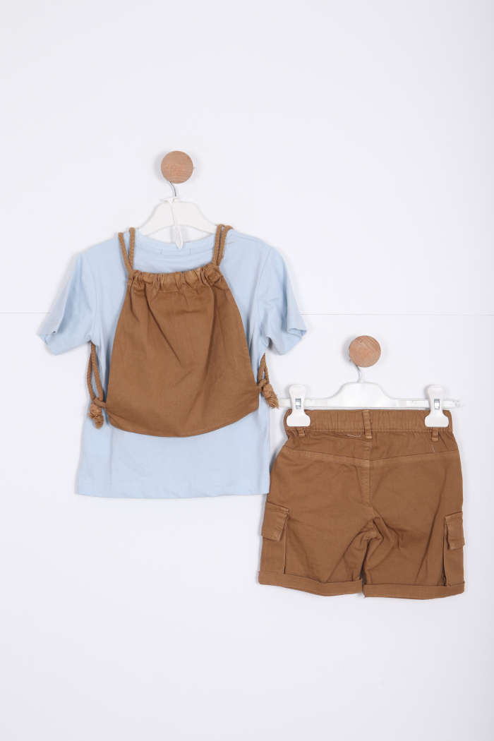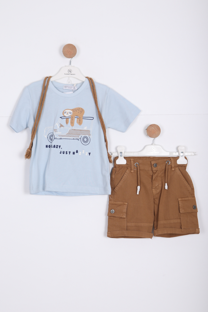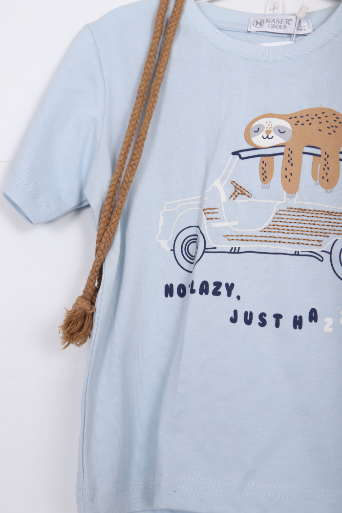 Bu erkek çocuk alt üst takımı, rahatlığı ve şıklığı bir arada sunuyor. Üst kısmı kısa kollu ve bisiklet yaka tasarımına sahip. Önünde sevimli bir araba ve tembel hayvan baskısı yer alıyor. Takımın en dikkat çekici detayı, ip kordonlu ve sırt kısmında küçük bir çanta şeklinde olan aksesuarı. Alt kısmı ise diz hizasında, cepli ve kordonlu bermuda şort olarak tasarlanmış. Hem günlük kullanıma hem de yaz ayları için ideal bir kombinasyon.