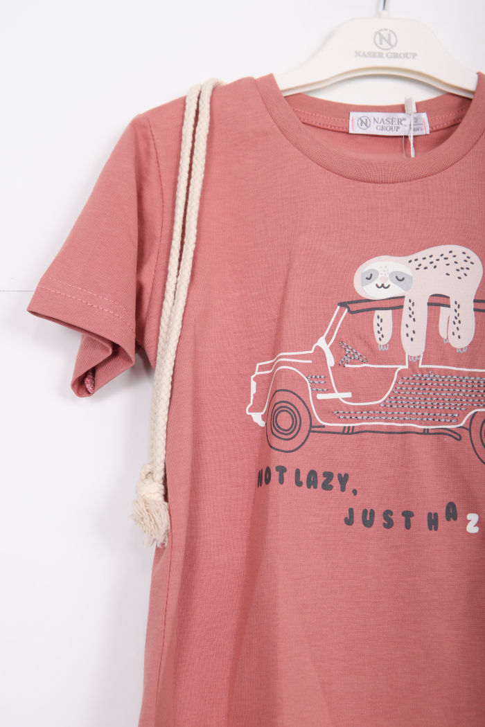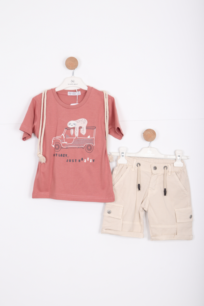 Bu erkek çocuk alt üst takımı, rahatlığı ve şıklığı bir arada sunuyor. Üst kısmı kısa kollu ve bisiklet yaka tasarımına sahip. Önünde sevimli bir araba ve tembel hayvan baskısı yer alıyor. Takımın en dikkat çekici detayı, ip kordonlu ve sırt kısmında küçük bir çanta şeklinde olan aksesuarı. Alt kısmı ise diz hizasında, cepli ve kordonlu bermuda şort olarak tasarlanmış. Hem günlük kullanıma hem de yaz ayları için ideal bir kombinasyon.